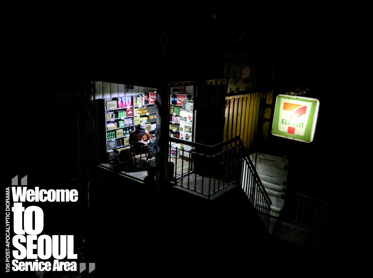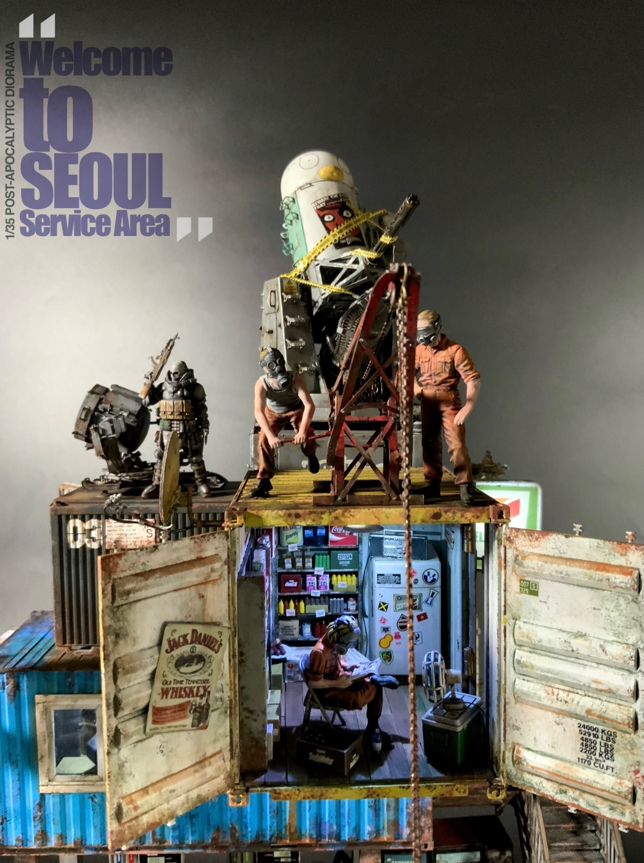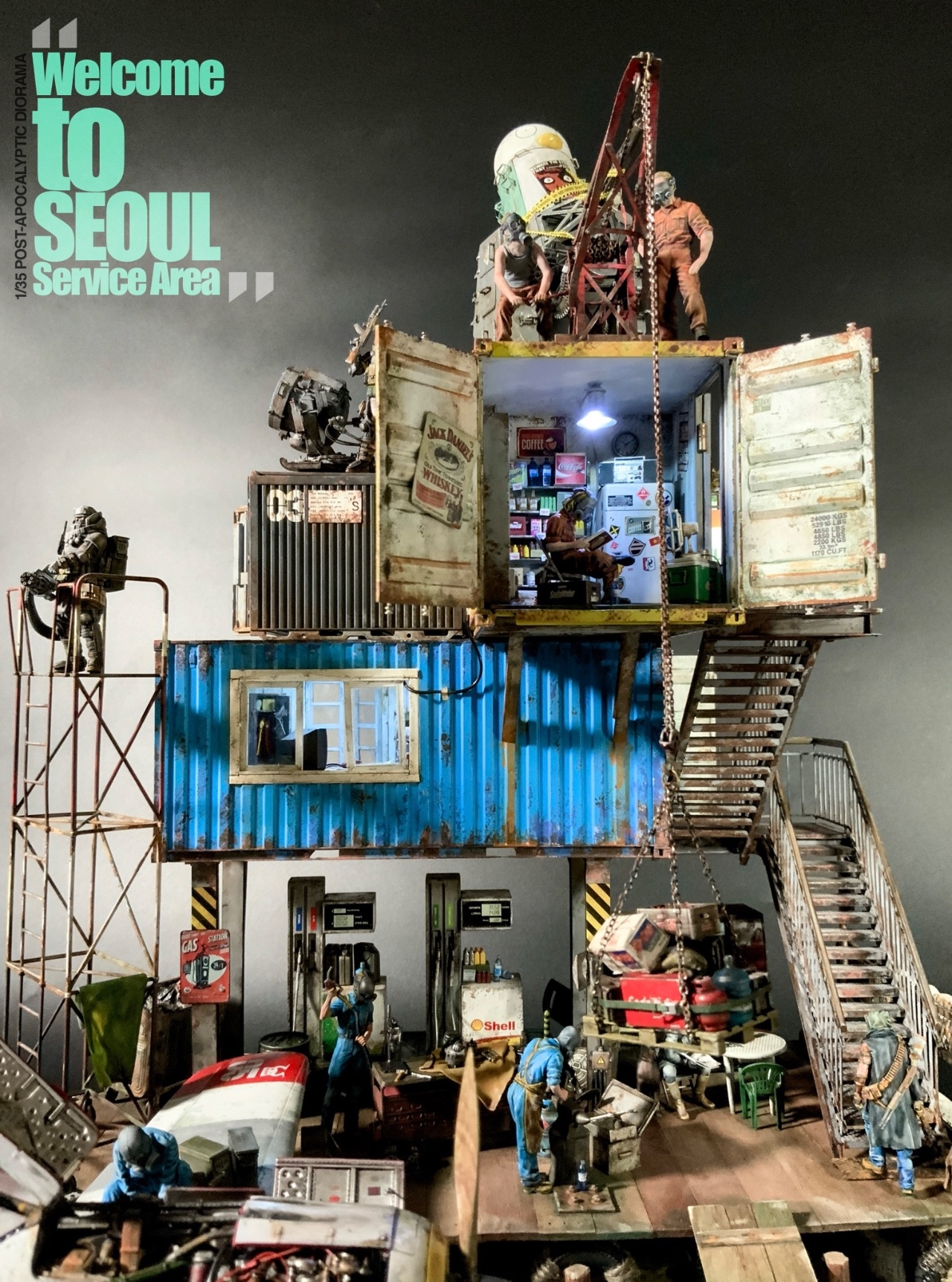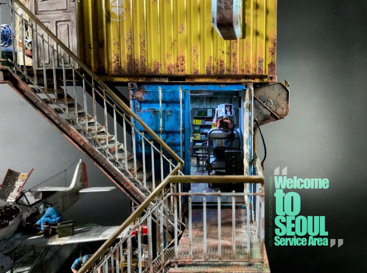 제3차 AI의 폭주 사태로 거대 제도권 국가의 소멸과 양 극지방 빙산과 영구동토층의 붕괴로 인해 해수면의 급작스러운 상승으로 육지의 80%가 수몰된 상황에서 AI의 재 폭주를 막기 위해 재래식 장비만을 사용하는 시대에 “물위에 오아시스 서울휴게소”를 표현한 포스트 아포칼립스 디오라마입니다