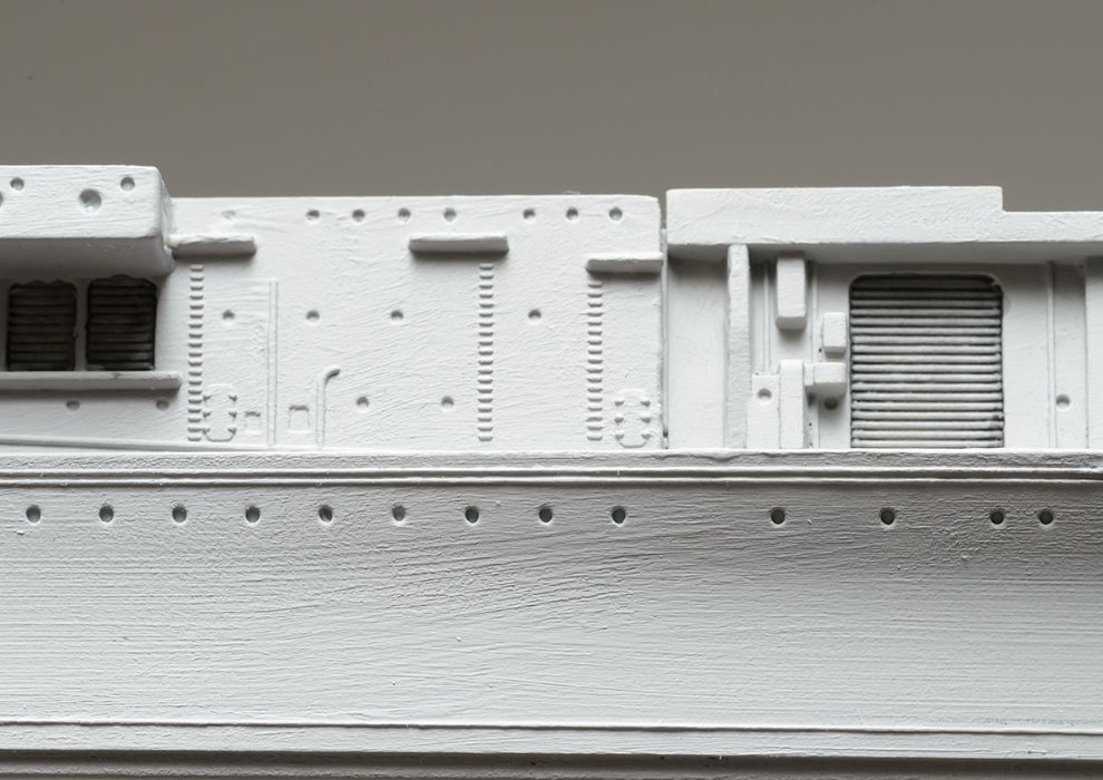 그러나 사진의 문짝이나 배관 파이프처럼 열린 경우에는 세필붓으로 흘려넣기 애매하고 주위로 퍼지기 일쑤입니다. 닫힌 경우에도 붓 삑사리로 주위로 삐져나오는 경우가 빈번하구요. 1/700 배 모형의 경우 유리창 (아래 구멍) 같이 굉장히 작은 디테일이 많아서 일일이 세필붓으로 정확히 거기만 찌르다보면 북두의 권 오의를 깨닫을 것 같습니다.