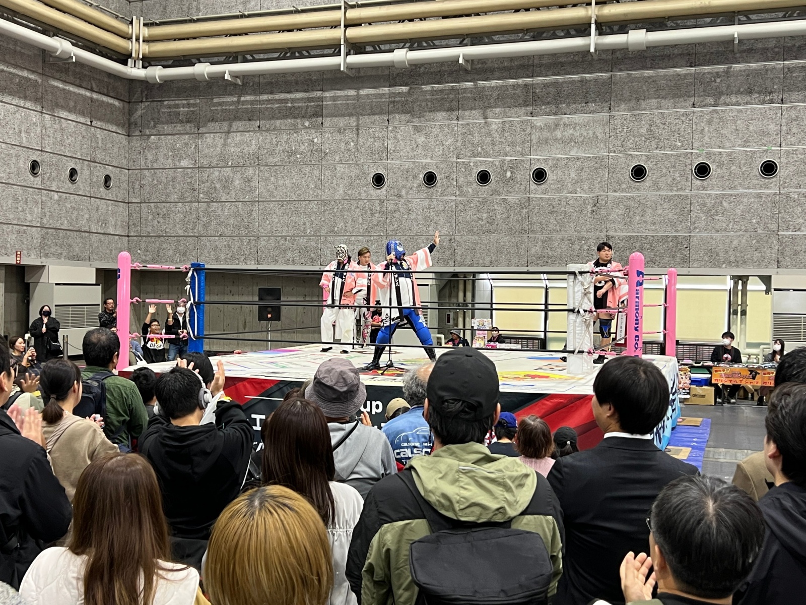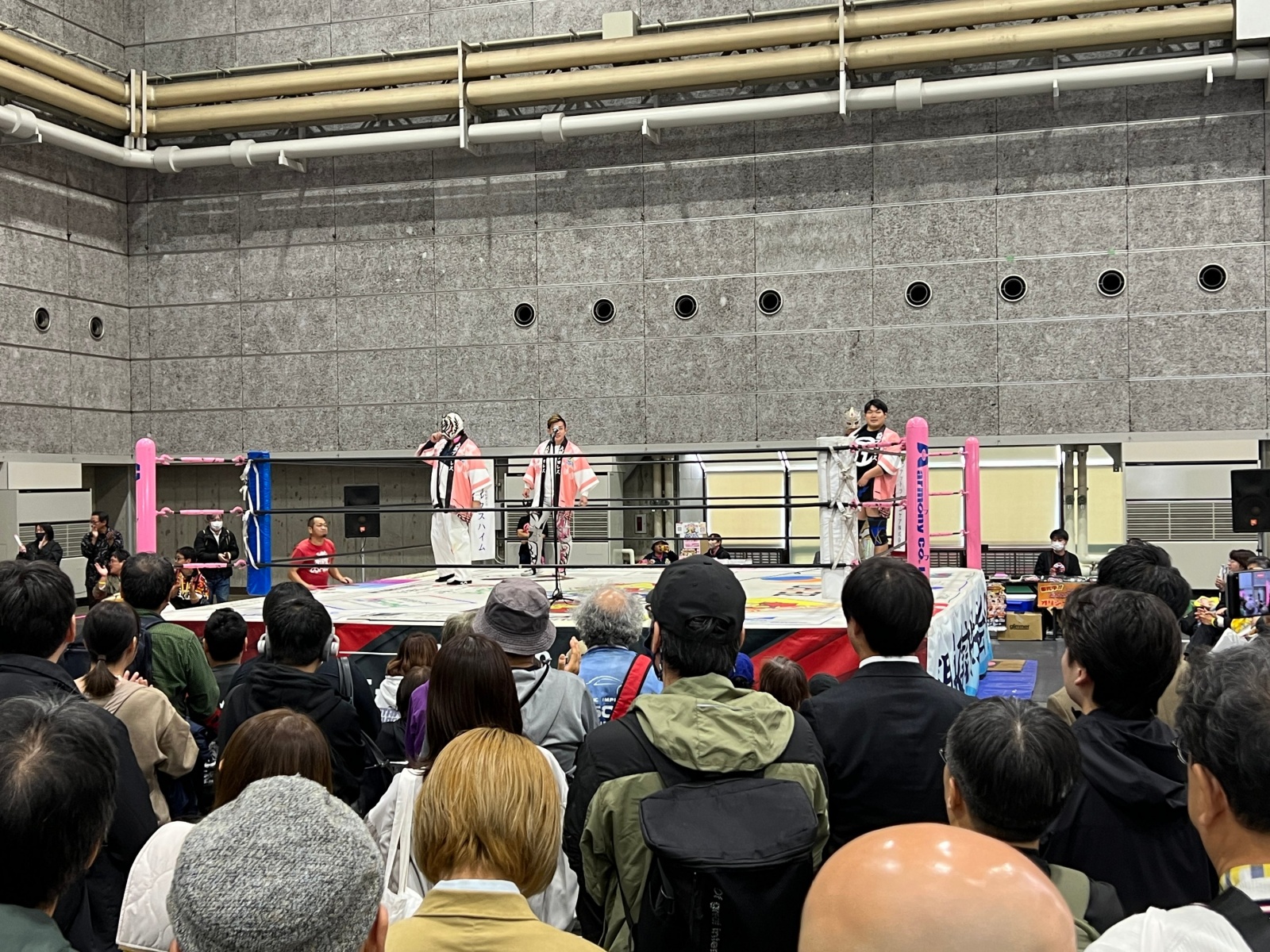 행사 후원사 중 하나가 오사카 프로레슬링 협회라 홍보용 시범 경기가 열리고 있었습니다.