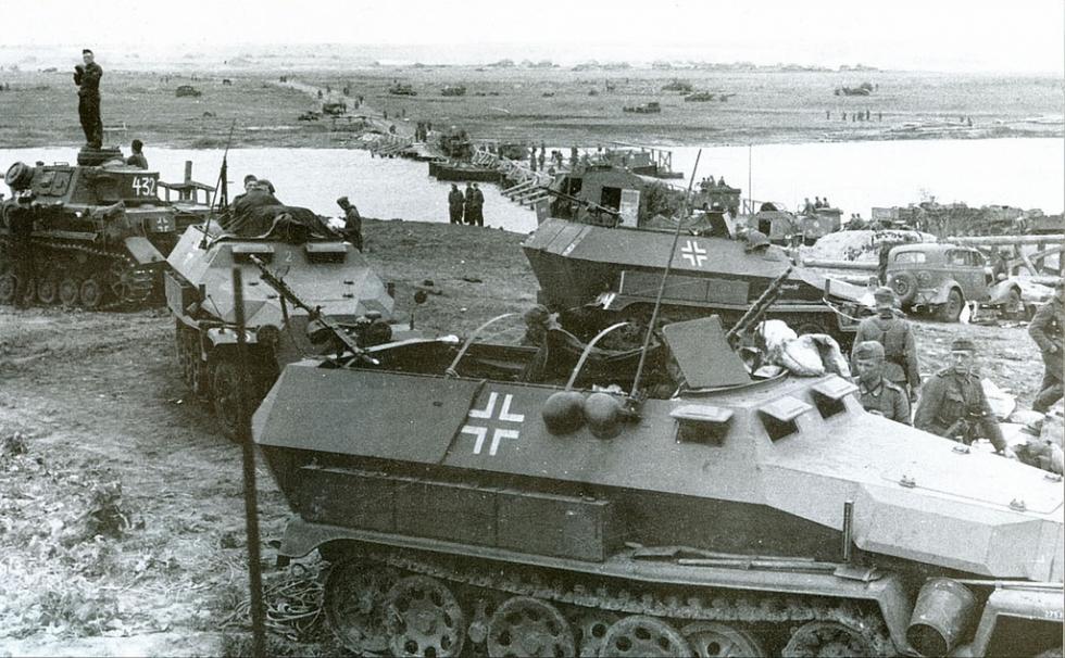 1942년 돈강을 건너는 24기갑사단..중간에 뒷면이 보이는 차량에 사단마크. 4호전차는 F2형