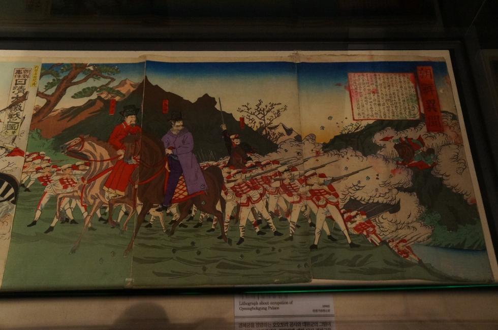 위의 두 그림은 일본에서 자신들의 승전을 기념해 그린 석판화입니다. 빨간 옷 입고 말 탄 양반이 흥선 대원군.