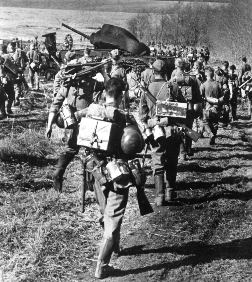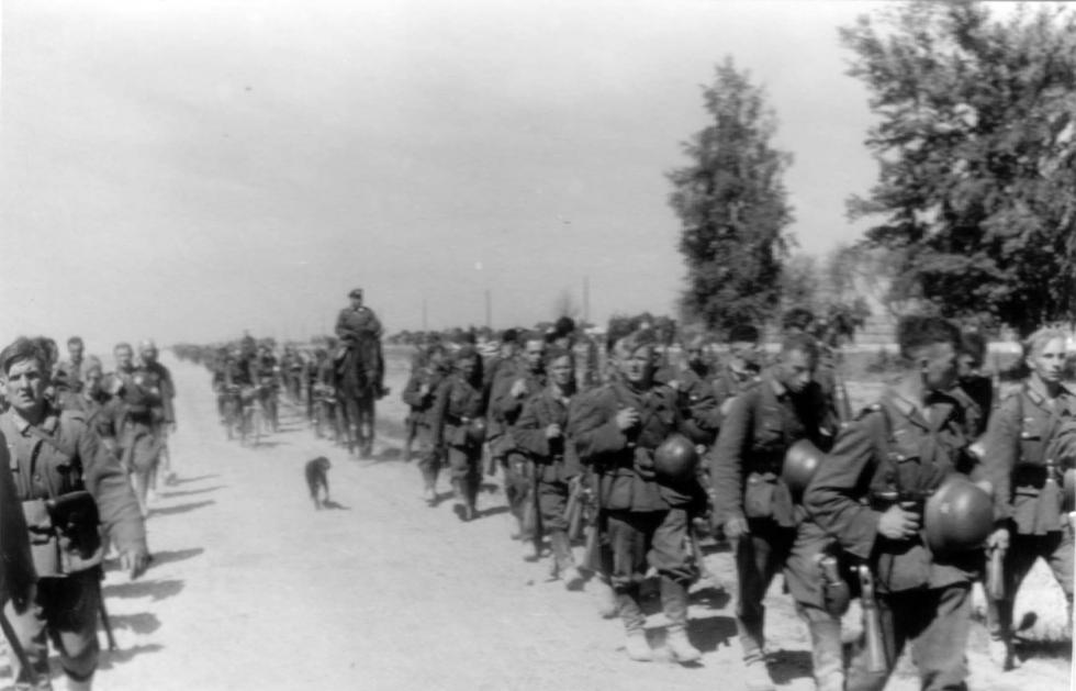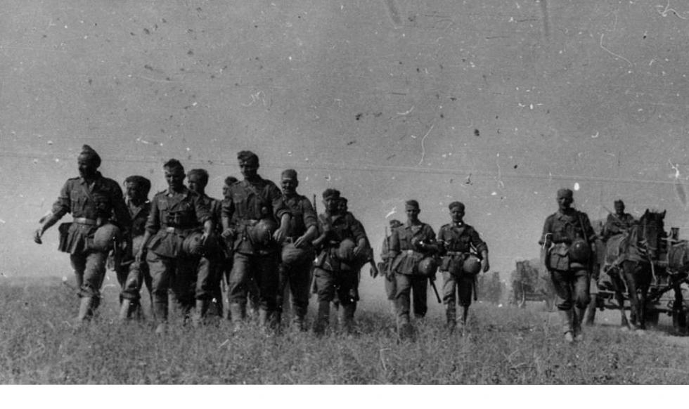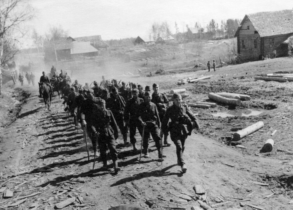 남부전선의 제1산악사단 병사들과 소련군 포로 행렬..
