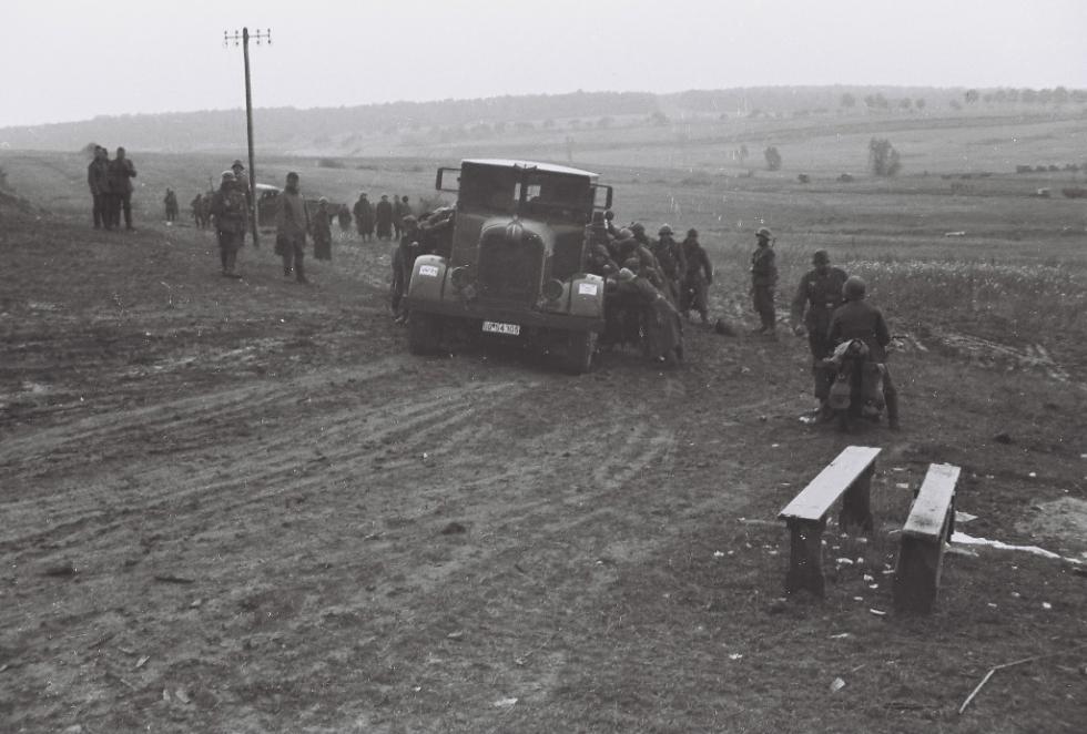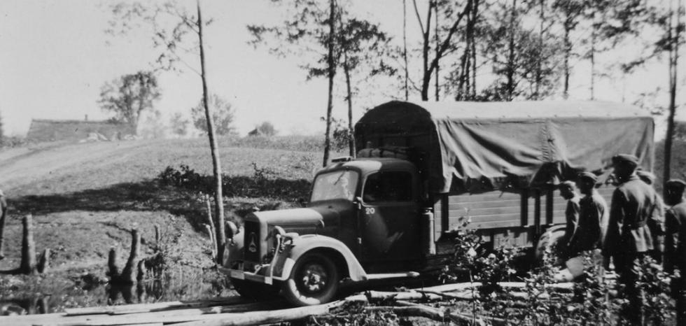 스몰렌스크의 도로에 Magirus 트럭과 표지판으로 사용되는 T-26 전차.