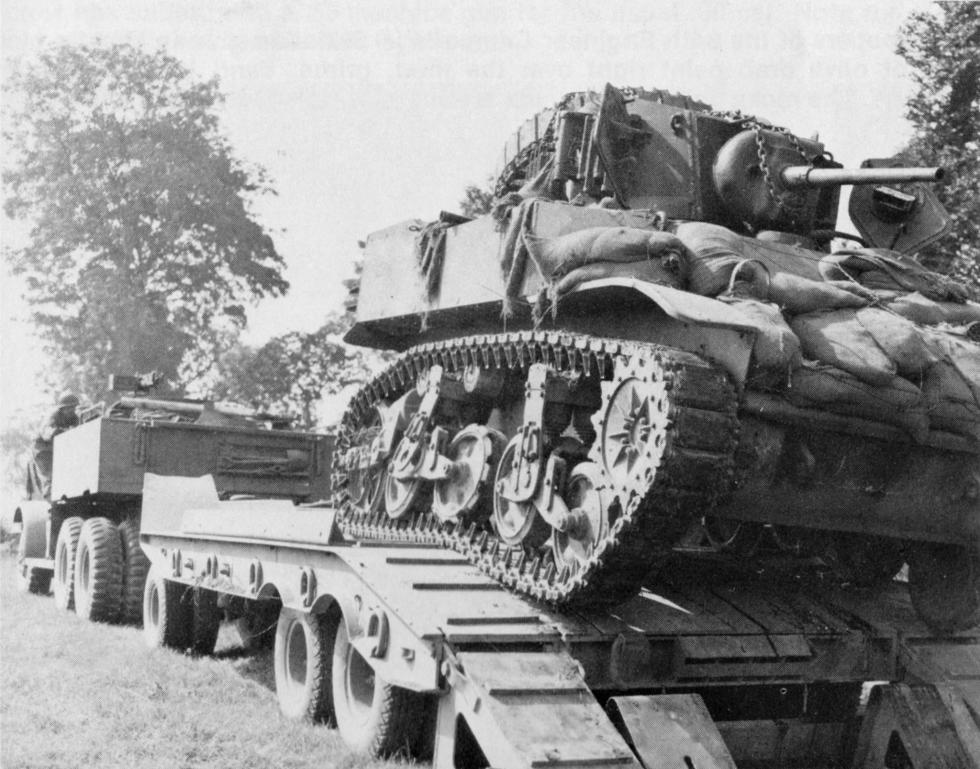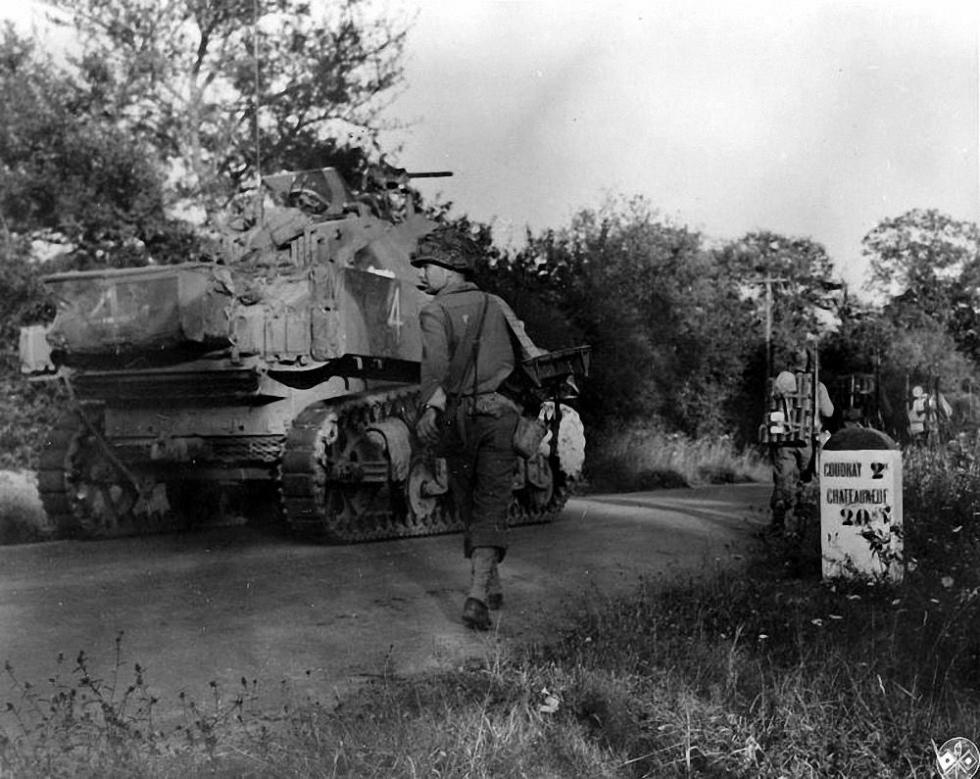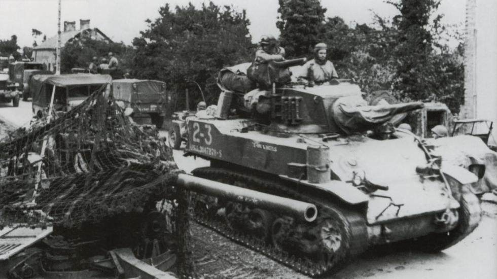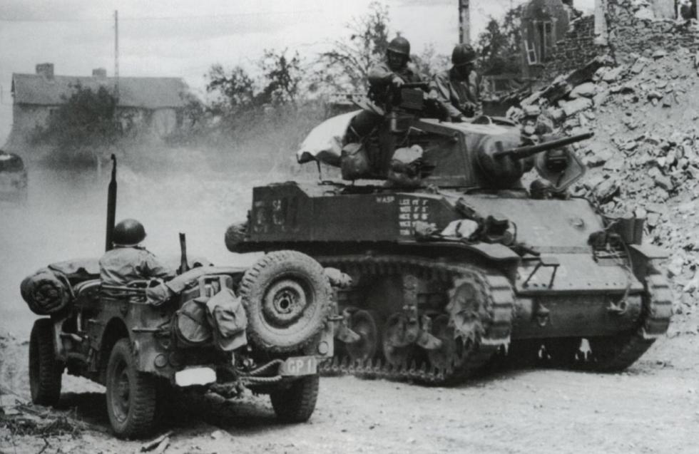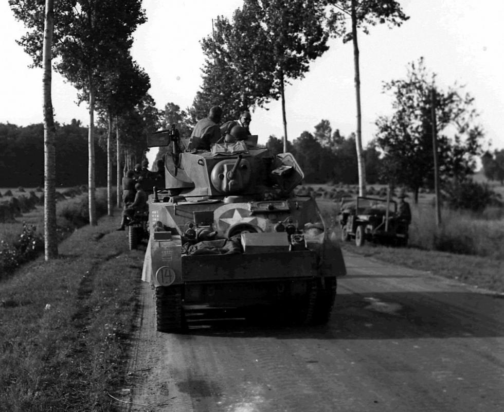 1944년 7월 생로..미29보병사단을 지원하는 747전차대대 소속의 스튜어트 전차.