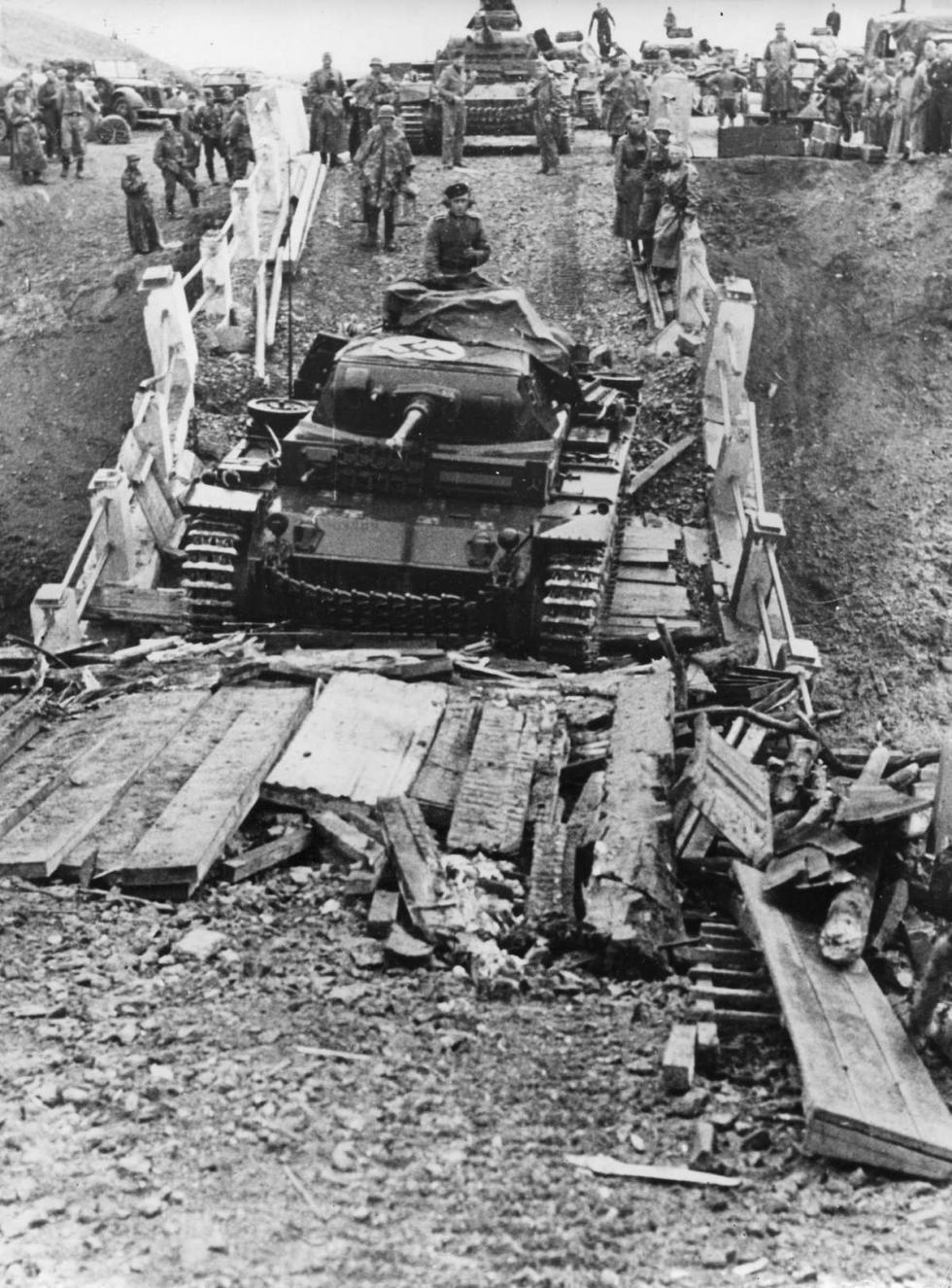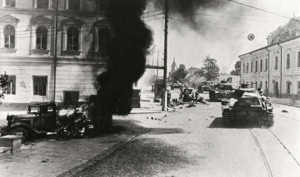 1941년 7월 지토미르에서 14기갑사단의 3호F형과 불타는 Gaz 트럭.