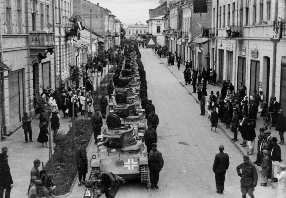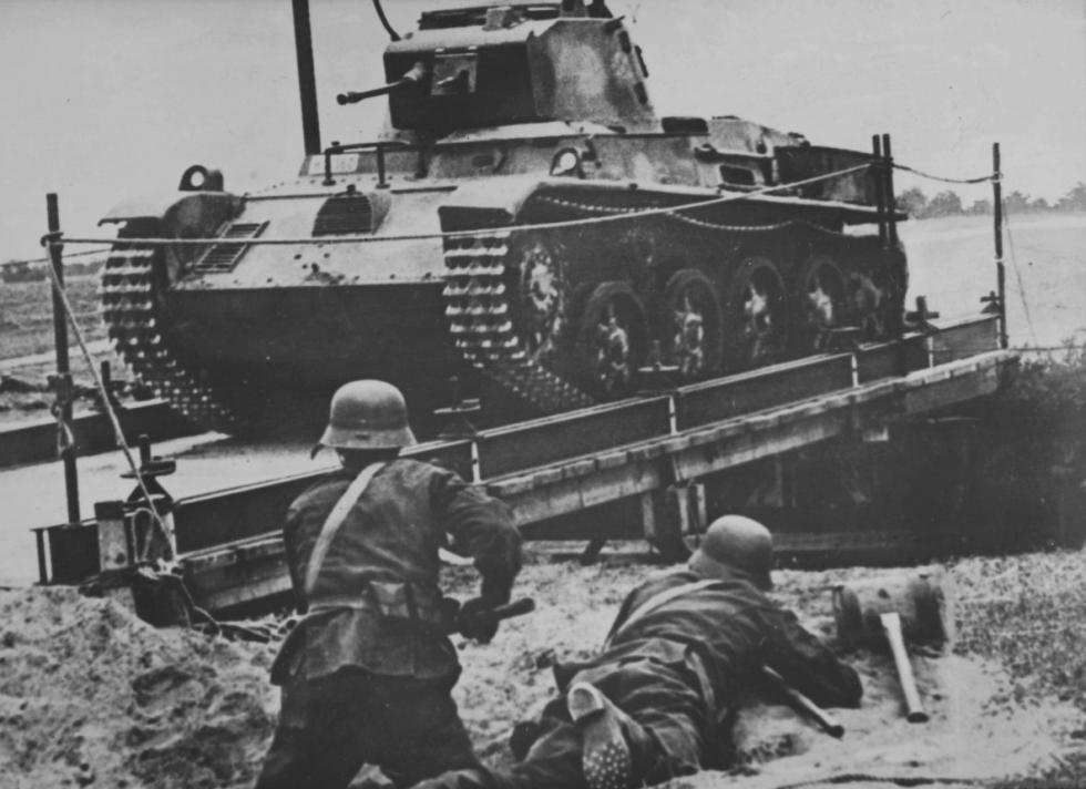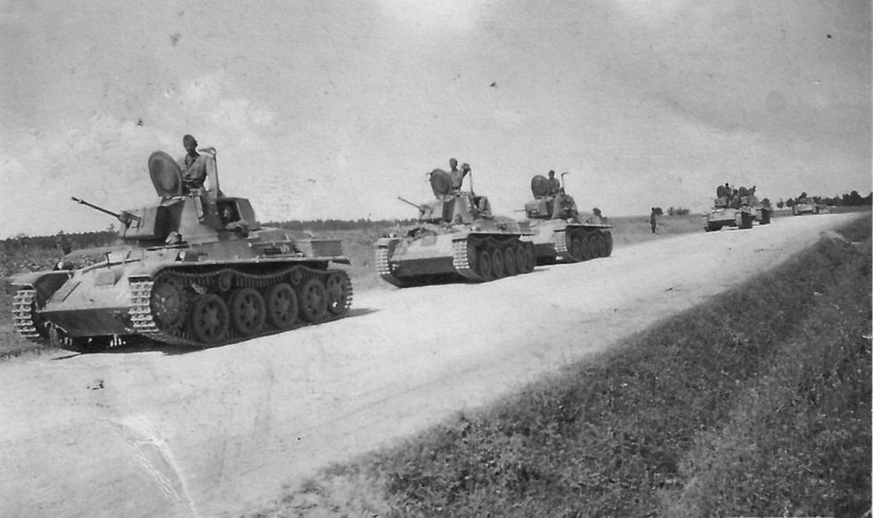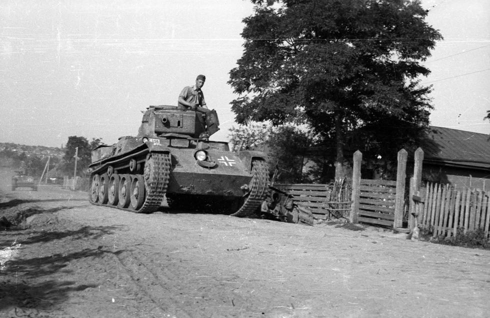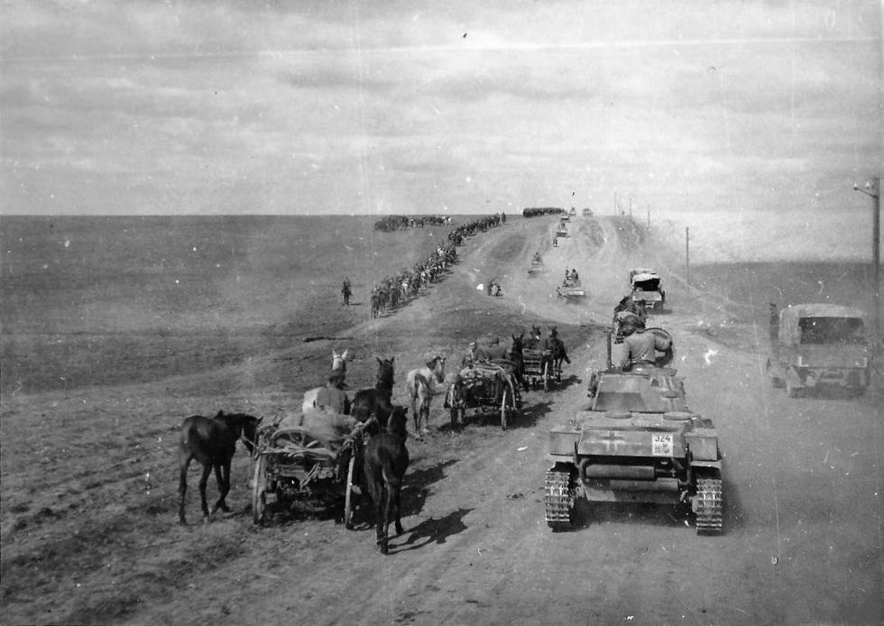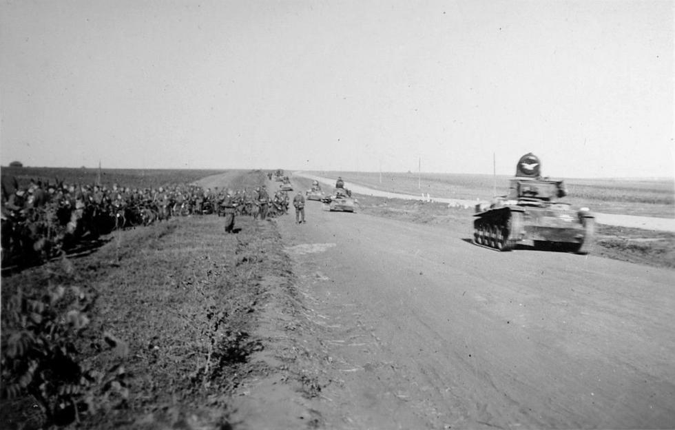 우크라이나에서 독일군 자전거 부대와 지나가는 톨디 전차 행렬..