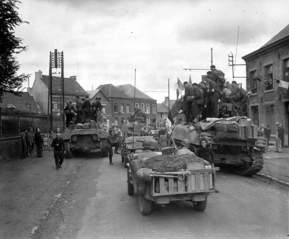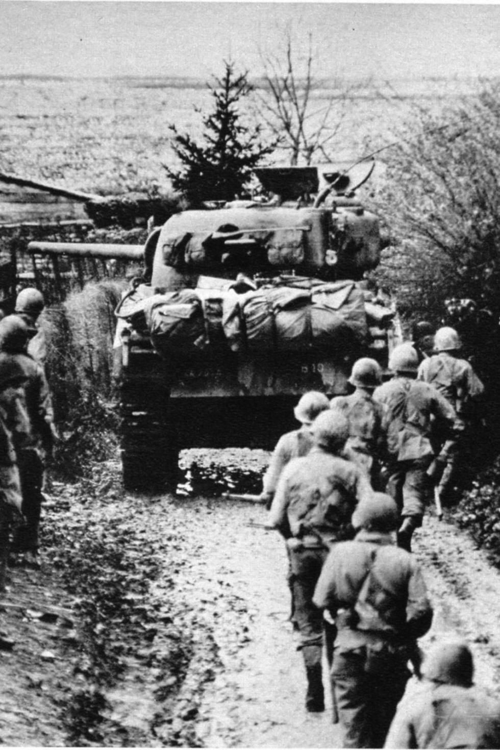 1944년 10월 메츠로 전진하는 전차와 병사들.