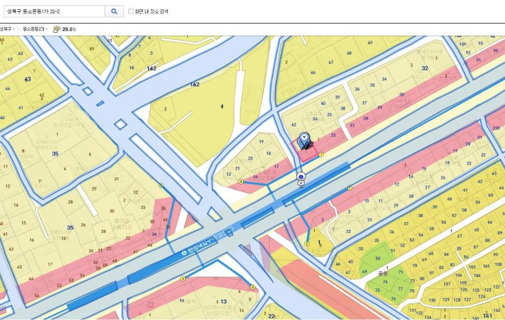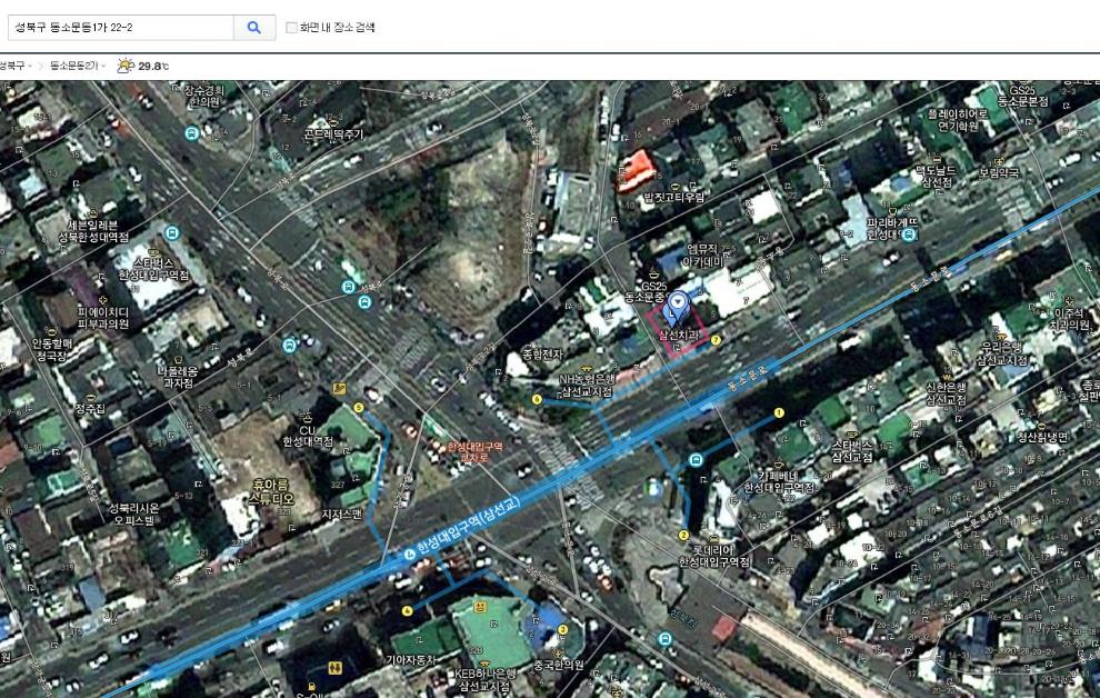 우선 현재 지도(지적 표시)에서 22번지는 없습니다. 당시 삼선교 아카데미 본점에서 A/S를 받으신 지인분의 의견에 따라 22-2번지가 당시의 위치로 파악이 되었습니다. 붉은 사각형으로 표시되어 있습니다.