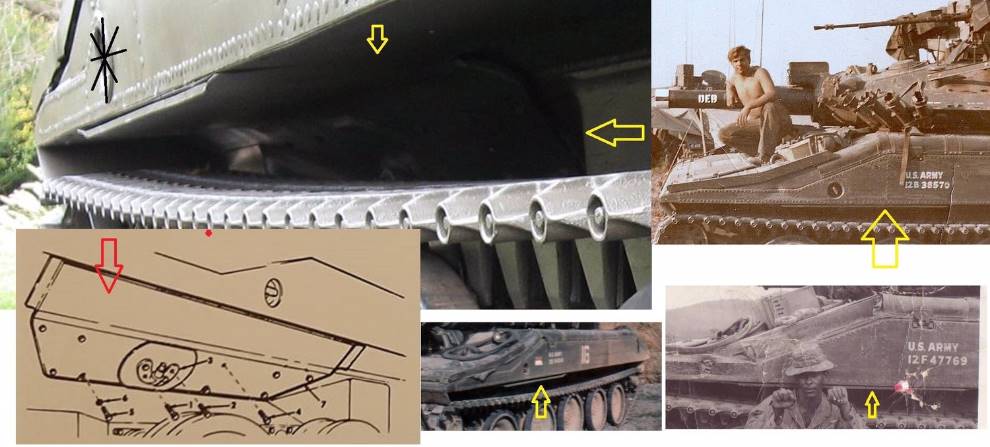 화살표에 해당하는 부분은 M551 차체 하부 전방에 설치된 것으로 유독 베트남전에 참전한 M551에서만 보이네요. 이게 보조장갑판으로 생각이 되는데 타미야의 그것에는 표현되어있지 않아 플라스틱 시트로 비슷하게 꾸며주려 했는데 키트를 다시보니 한동안 이해가 되질 않았더랍니다.