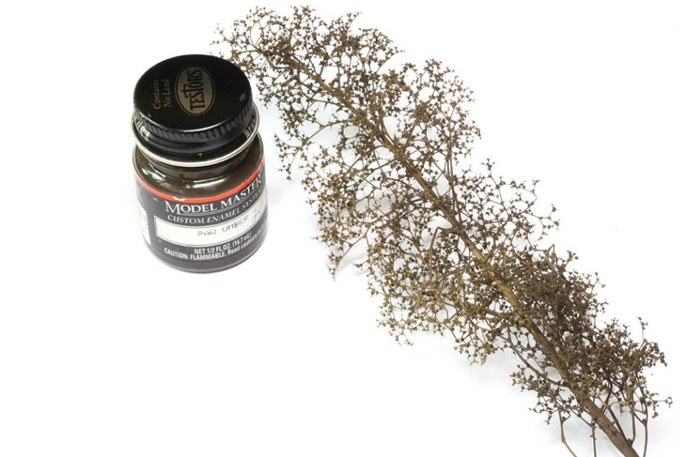 모델마스터 에나멜 로우엄버로 드라이플라워에 전체적으로 에어브러싱을 해주었다. 이렇게 어두운톤으로 도색을 한후 잎사귀를 붙이면 더욱 자연스러운 나무의 형태가 된다.