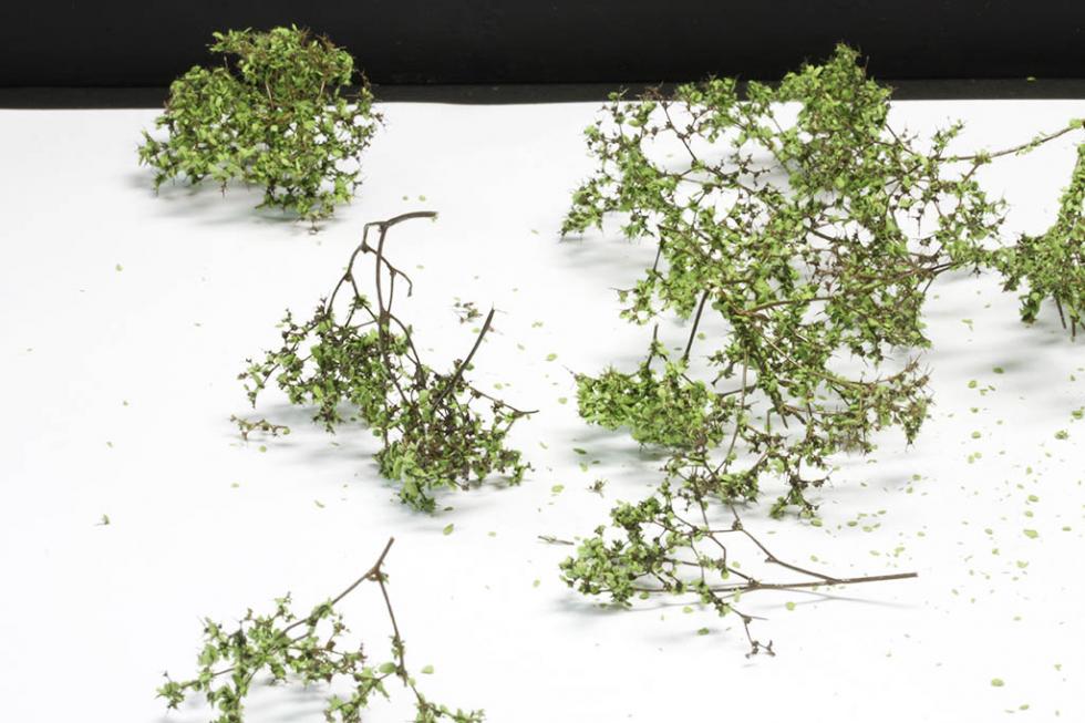 건조가 되면 나무가지에 NOCH 스프레이 접착제를 분사후 잎사귀를 붙여준다. 붙이는 방법은 매우 간단하다. 접착제가 묻은 나무가지 안쪽과 바깥쪽에 골고루 잎사귀재료를 떨어트려주면 된다. 어느정도 건조가 된 후 헤어드라이기로 약한바람을 쏘이면 더욱 단단하게 접착이 된다.