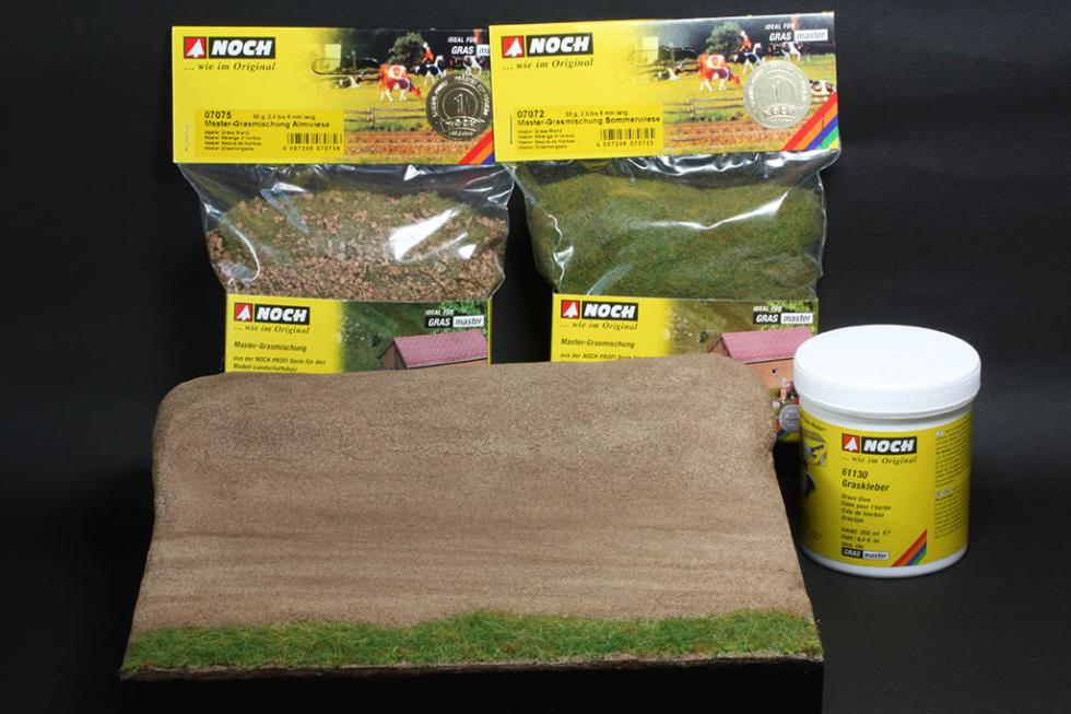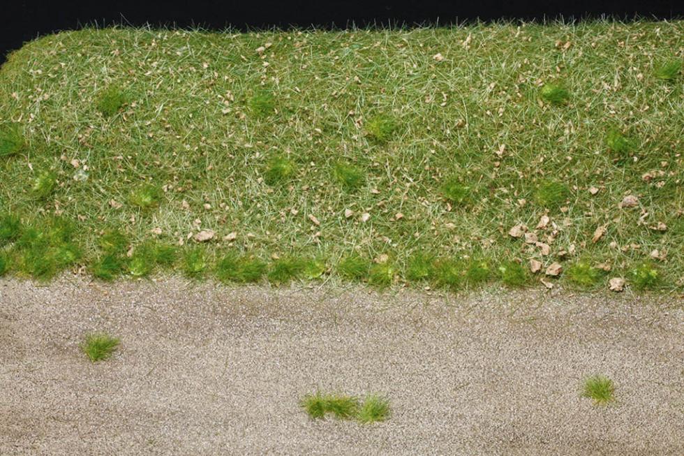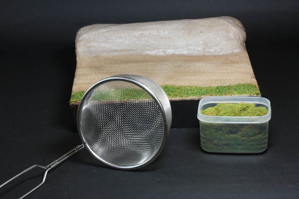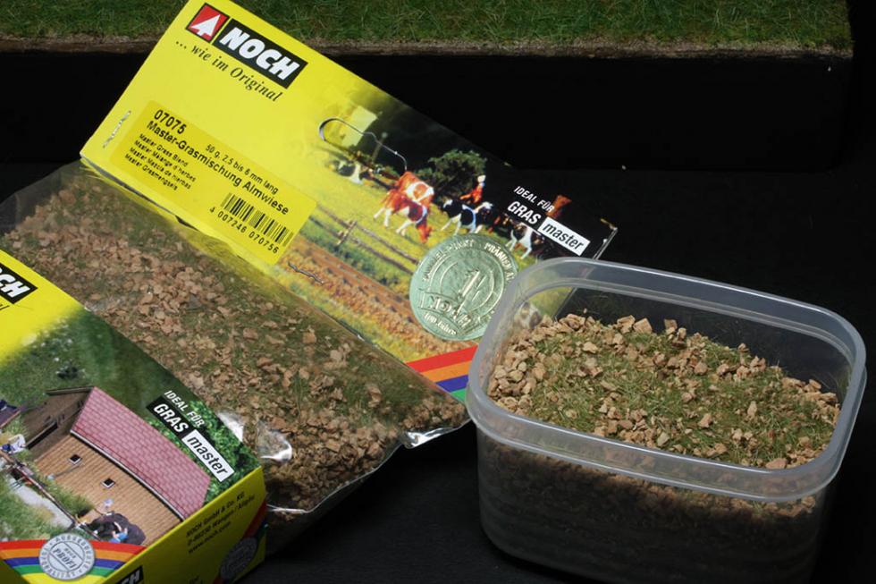 Noch61130 Grass Glue 를 페인트붓으로 발라준 후 그라운드를 커버하는 재료인 Noch 07072 를 주방에서 사용하는 망을 이용하여 내려주었다. 이어서 작은 바위조각이 잔디와 혼합되어있는 Noch 07075 를 내려주어 쉽게 볼수있는 산 언덕의 모습을 표현하였다. 잘게 조각낸 콜크에 채색을 한 제품으로 마치 산에서 볼수있는 작은 돌등에 흙먼지등이 묻은듯 한 느낌을 준다. 재질이 콜크라 핀셋으로 잡기편하고 무엇보다 수성접착제로 접착이 잘된다.