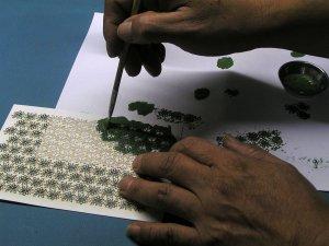 나뭇잎에 채색을 하고 핀셋으로 모양을 잡아줍니다. 종이재질인 만큼 아크릴 물감으로 도색시 색감이 더 곱고 건조가 빠릅니다.