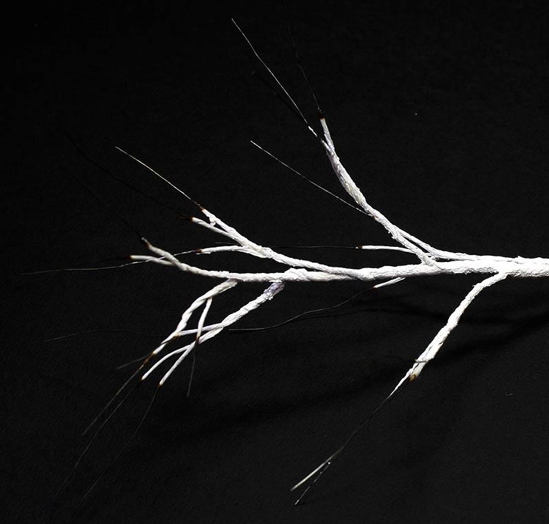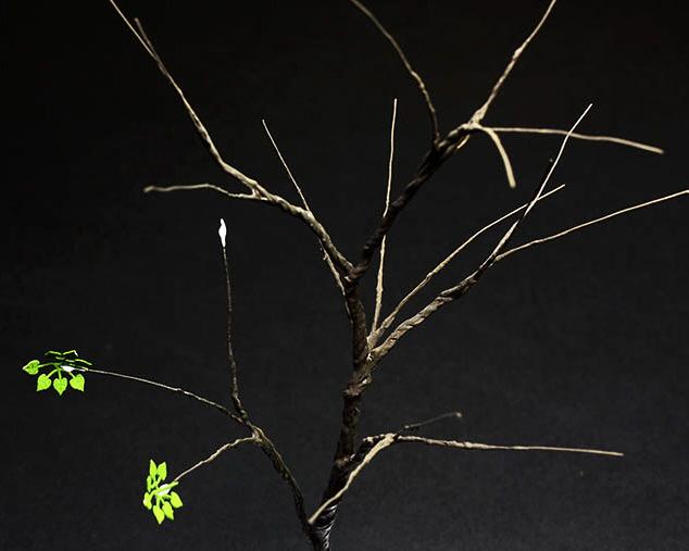 3 단계 : 나무잎을 붙일부분을 라이타로 태워 종이를 벗겨냅니다. 사진과 같이 아주가는 가지를 얻을수 있습니다. (사진 3)