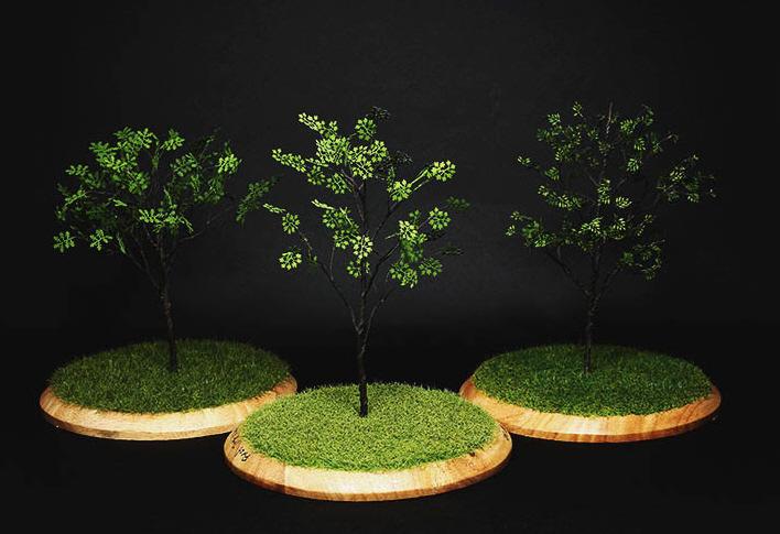 이제 나뭇잎을 붙일 차례 입니다. 에어브러싱 또는 붓으로 채색을 해줍니다. 타미야아크릴 도료 기준 Flat Green, Yellow, White 를 (5:3:2) 비율로 혼합하면 요즘 우리나라에서 흔히 볼수있는 나뭇잎 색상을 표현할수있고, Olive Green 에 Yellow 를 혼합하면 유럽풍의 조금 진한나뭇잎색상을 얻을수 있습니다. 나뭇잎 색상은 거리의 가로수 또는 공원에 있는 나무, 집에 있는 화초등에서 얼마든지 아이디어를 얻을 수 있습니다.