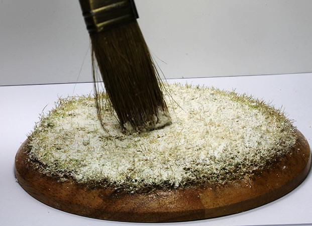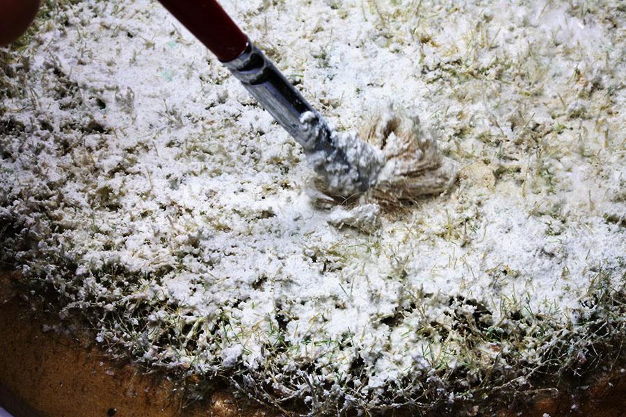 2) 혼합한 눈재료를 망가진 붓이나 나무주걱등을 이용하여 지면에 발라줍니다. 골고루 바른다음 붓을 세워서 사진과 같이 찍어주면 쉐이크 안의 스노우파우더와 크리스탈이 혼합되며 자연스럽게 정착이 됩니다.