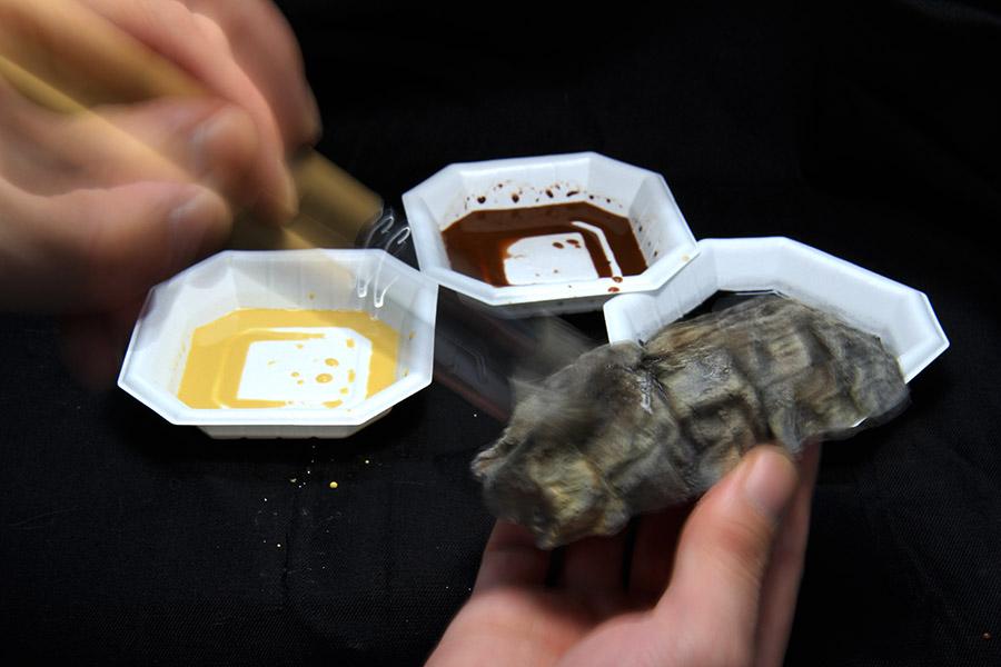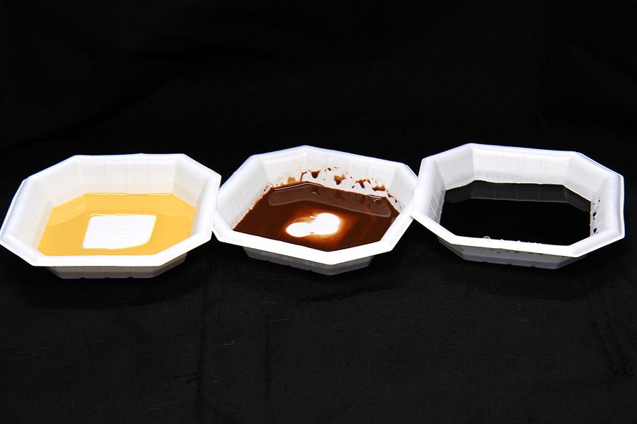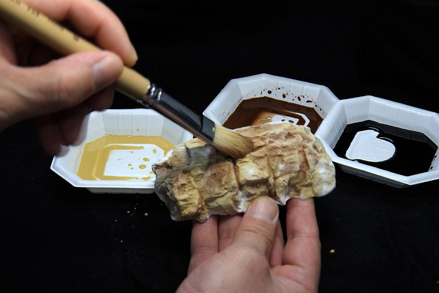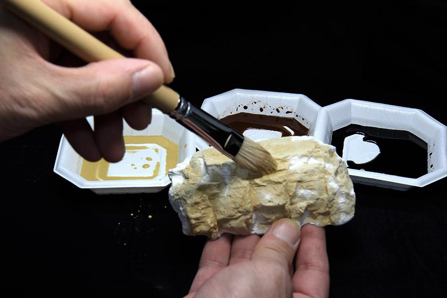 바위 는 블랜딩 을 하여 질감 을 살려 줍니다. Noch 리퀴드 피그먼트 중 엘로우엄버, 번트엄머, 블랙 3색을 사용 합니다. 물과 리퀴드 피그먼트 의 혼합 비율은 3:1 정도 로 맞춥니다.