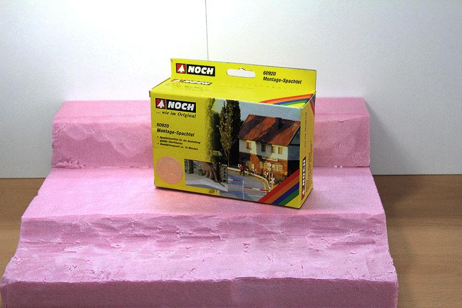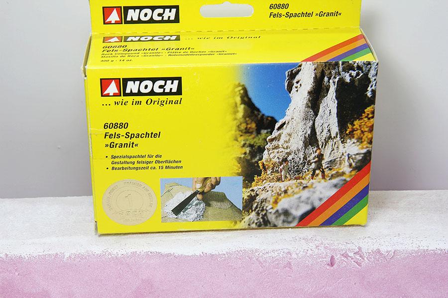 저는 바위주변 의 질감 또는 산 또는 언덕지대와 같이 러프한 느낌 을 살릴때 적합한 재료 인 Noch 의 Rock compound 를 사용하였습니다. 화강암 과 샌드스톤 두 가지 가 있습니다. 락 컴파운드 는 두텁게 발라도 크랙현상이 없고, 무엇보다 바위 몰드, 자갈, 모래 등을 함께 붙일 수 있다는 점 이 장점 입니다.
