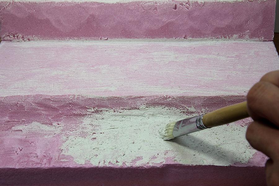 3) 전체적으로 바른 다음 어느정도 건조 되었다 싶을때 붓 을 세워서 땅의 질감 을 표현 해 줍니다. 아래 사진 처럼 붓을 세워서 계속 두두려 주면서 땅의 질감 을 표현 하는 방법 입니다.