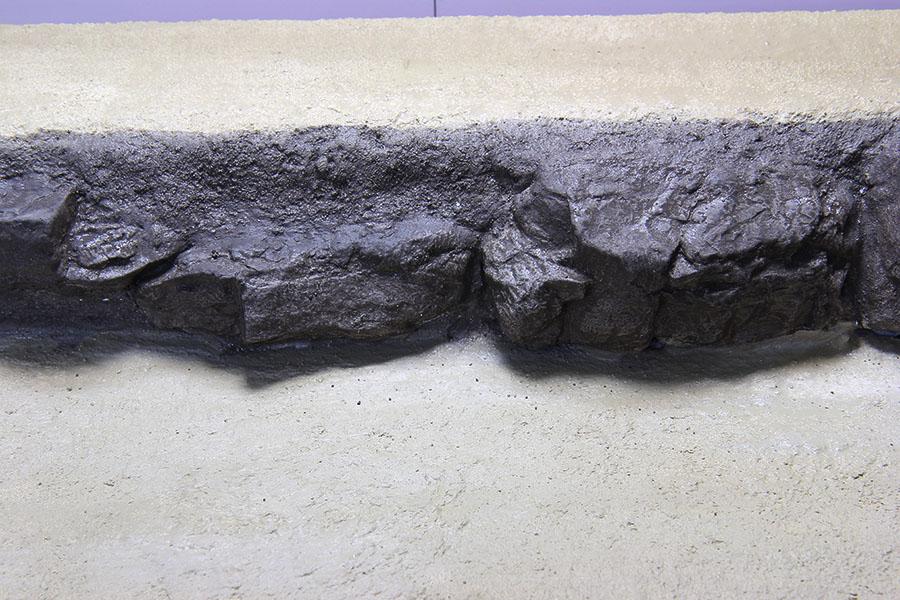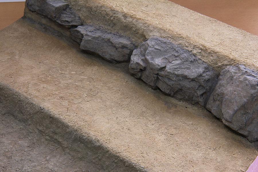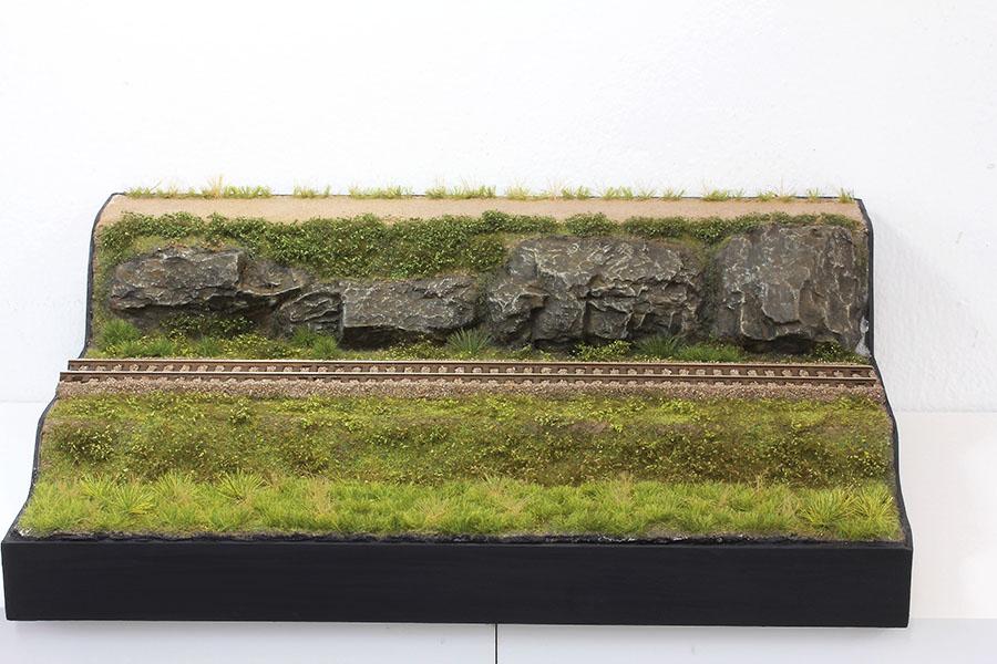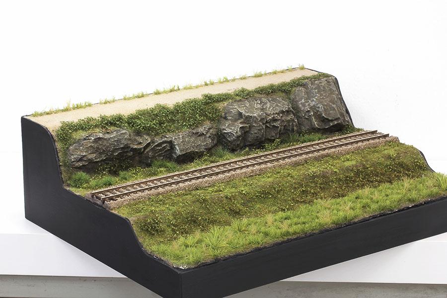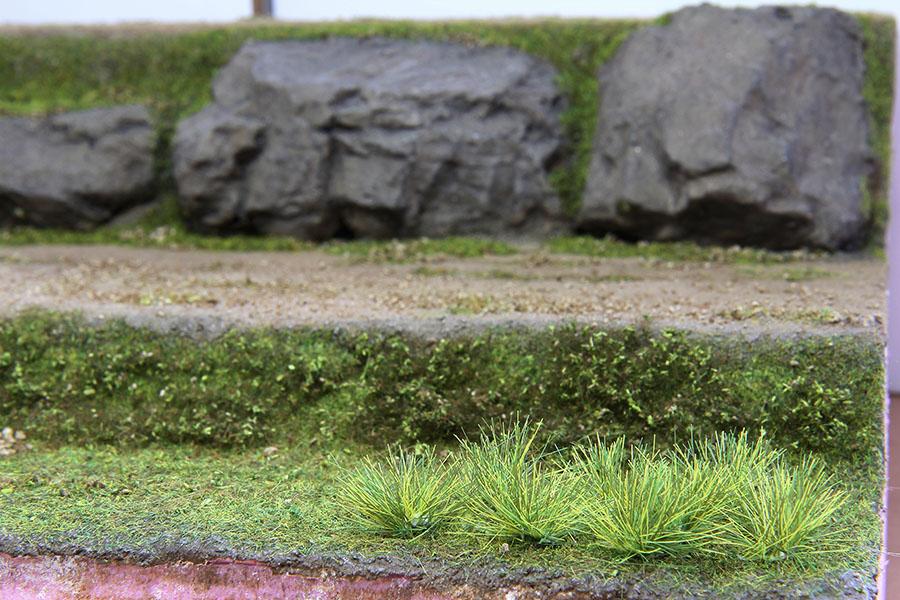 2) 락 컴파운드 로 바위를 붙여주었습니다. 샌드스톤 이 없어 화강암 지대 표현 용 을 사용 했습니다. 전에 제작한 바위를 전체적으로 진한 회색으로 칠해주었습니다. 바위주변 질감은 위에서 설명한 돈모 붓 으로 찍어가면서 표현 하였습니다.