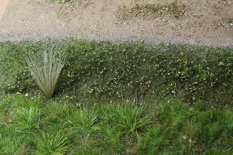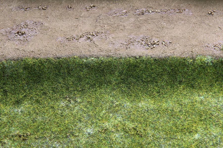 자갈이 어느정도 마르면 목공본드 가 투명해 집니다. 그러면 전체적으로 목공 본드를 바르고 잔디가루 를 내려 줍니다. 지면 바로 위에 올라가는 잔디 는 길이 가 짧은 걸 사용합니다. 기본 잔디 위에 각각 길이가 다른 잔디 들 을 렌덤하게 붙여주면 풀 지대 를 좀더 사실감 있게 구성할 수 있습니다.
