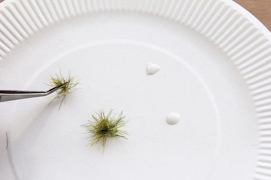 길이 6mm 이상 되는 잔디 들은 스팟형태의 잔디로 제작 할수 도 있고, 또한 핀셋으로 심을 수 있습니다. 물론 잔디의 퀄리티(굵기 와 탄성) 가 좋아야 합니다. 먼저12mm 로 조금 길이가 있는 Noch 제품으로 제작해 보겠습니다. 일회용 접시 에 이쑤시개 등 으로 Noch Grass Glue 를 떨구어 줍니다. 참고 로 Noch 의 그라스 글루 는 농도가 잔디붙이기에 최적화 된 수성 본드 입니다. 또한 건조 가 느리기 때문에 잔디의 가장 아랫단 레이어가 그라스 글루 를 흡수하게 되는데, 이러한 장점으로 인해 아래 사진의 작업을 가능하게 합니다.