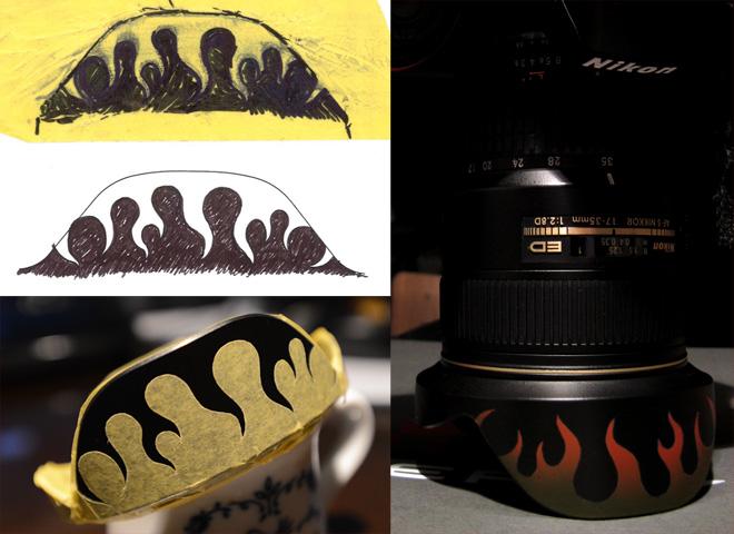 1. 넓은 마스킹 테이프를 렌즈 곡면에 붙이고 그 위에서 직접 마음에 드는 크기의 불꽃을 대충 스케치