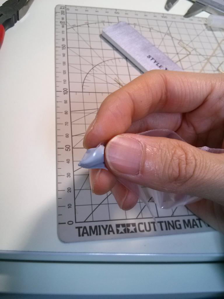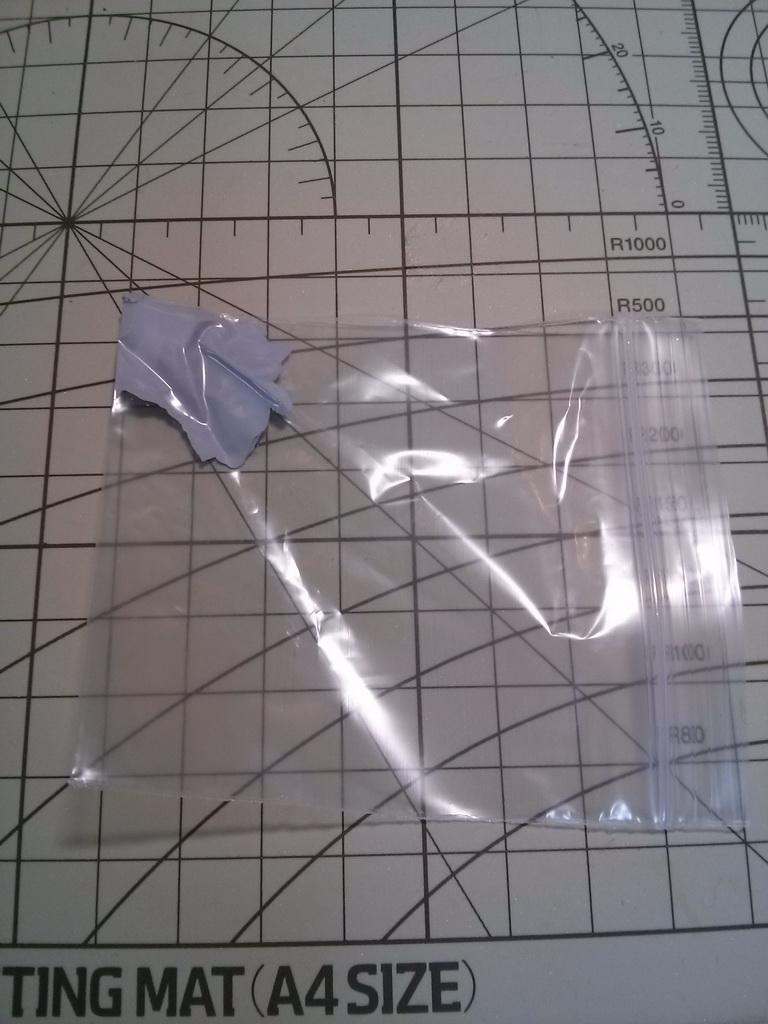 '다있어'에서 천원에 백장쯤하는 소형 지퍼백입니다. 한쪽 모서리를 칼로 아주조금 잘라내고 내부에 퍼티를 짜 넣습니다.