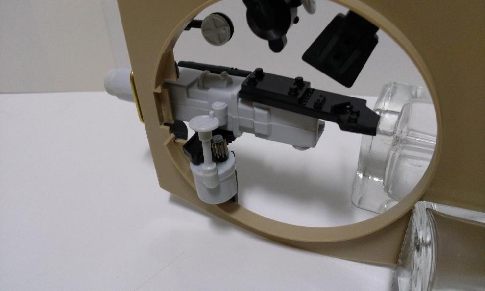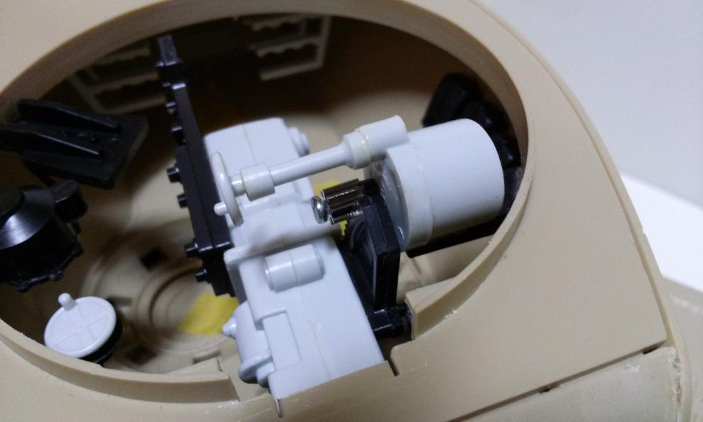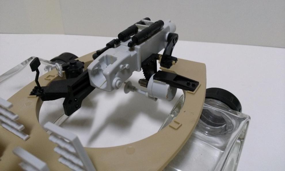 사진의 포신부 우측 모터같은 회색 부품 고정되는 플라스틱기어(8T)가 일그러지고 고정 핀이 파손되었습니다. 1/24스케일으로서 무게가 많이 나가 힘을 많이 받는 부위입니다. 특히 기어를 활용하여 가동이 가능하게 한 시도는 좋으나 아무래도 플라스틱의 재료특성상 파손이 잘 되는 것 같습니다.