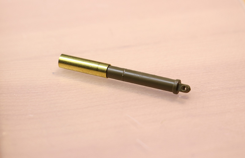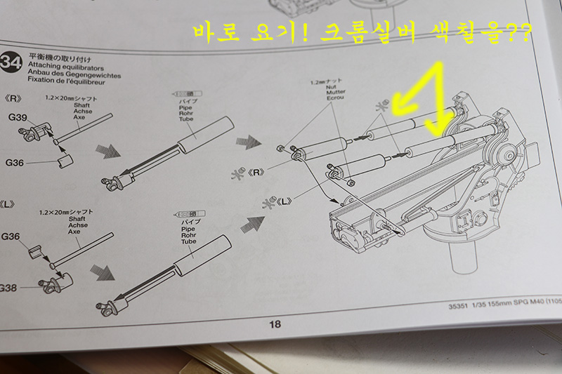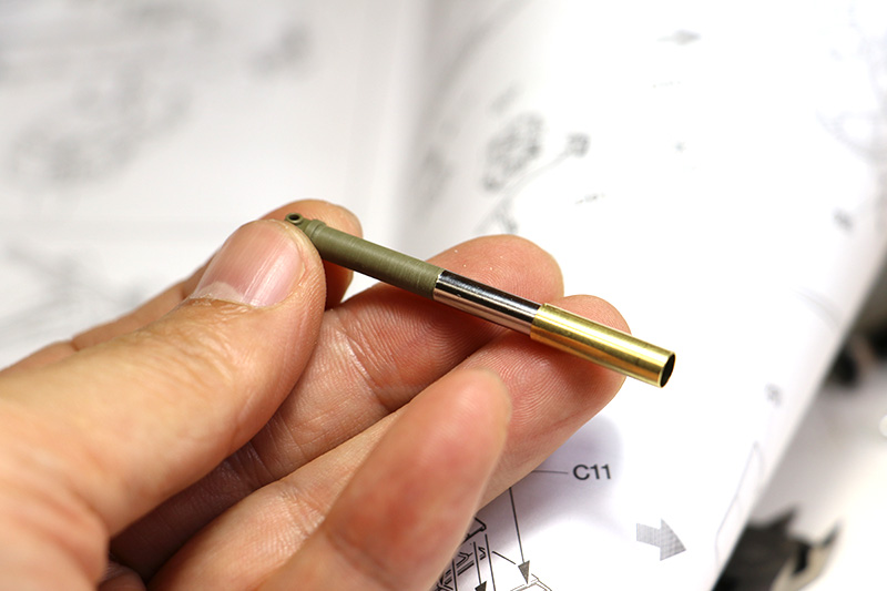 일단 저 부분은 플라스틱 부품. 게다가 포신의 고각에 따라 구리파이프 속을 들락날락하는 구조입니다. 설명서에는 x11번 에나멜 크롬실버로 색칠하라고 되어 있네요.