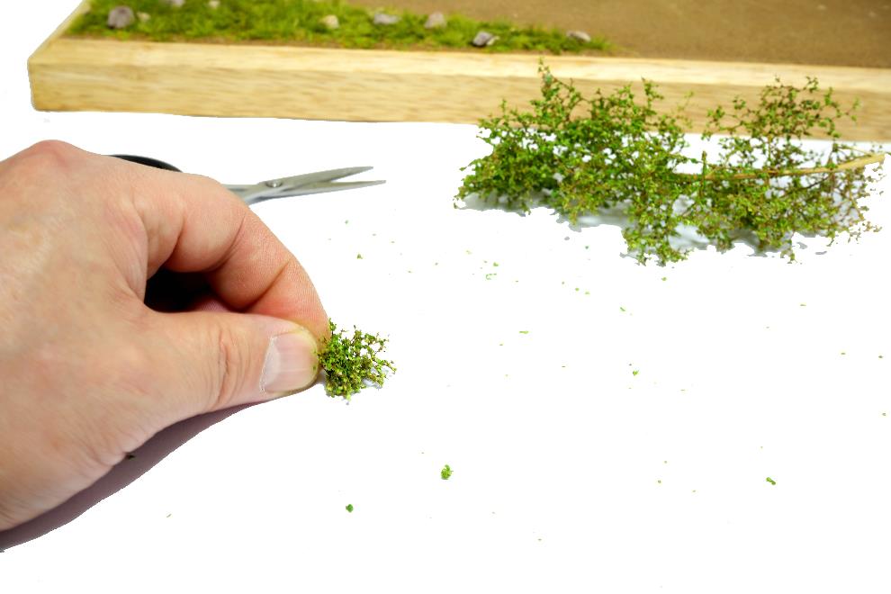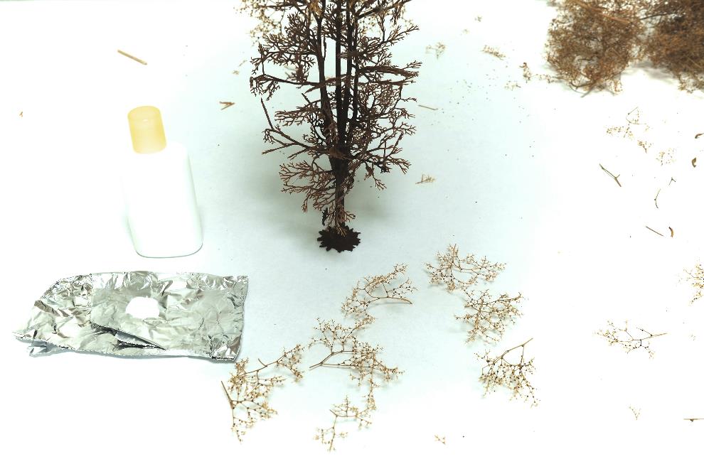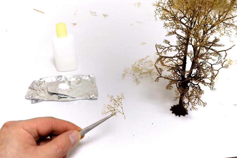 네이쳐트리를 손으로 뜯어면 아래사진과 같이 떨어지는데 이렇게 떨어진 네이쳐트리를 붙여주면 나무가지의 모습이 된다. 접착은 목공본드 원액을 사용한다. 접착법은 나뭇가지에 목공본드를 먼저 바른 후 네이쳐트리를 핀셋을 이용하여 붙여준다.