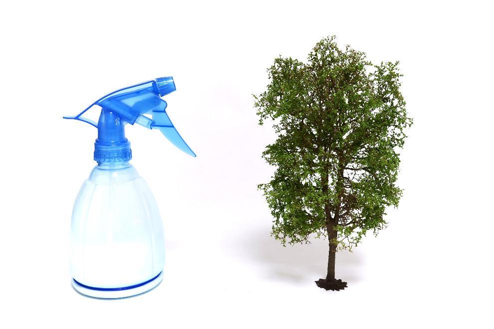 나무제작에 가장 중요한 단계이다. 헤어스프레이는 접착력이 약하다. (만약 접착력이 강하다면 아마 사람들이 절대로 머리에 뿌리지 않을것이다.) 따라서 건조된 후 조금만 충격을 받아도 네이쳐트리에 붙은 나뭇잎들이 떨어져 나간다. 즉, 헤어스프레이는 임시고정용으로 사용한 것 이며 최종단계로 나뭇잎이 떨어지지않게 정착 시켜주어야 한다. 지금가지 우리는 디오라마 전경표현에 목공본드를 사용하였다. 이 목공본드를 아주 묽게 희석하여 전체적으로 나무에 뿌려주면 된다. 일종의 마감제 역활을 하기도 하는데, 목공본드를 뿌려주면 채도가 높고 생동감있는 컬러로 나뭇잎의 색상이 바뀌기 때문에 완성도를 높일수 있는 장점도 있다. 흥건하게 묻어도 건조후 사라지기 때문에 걱정할 필요는 없다. 여기서 중요한 농도는 아래사진 과 같은 스프레이 버틀의 노즐로 분사가 될 정도 면 충분하다.