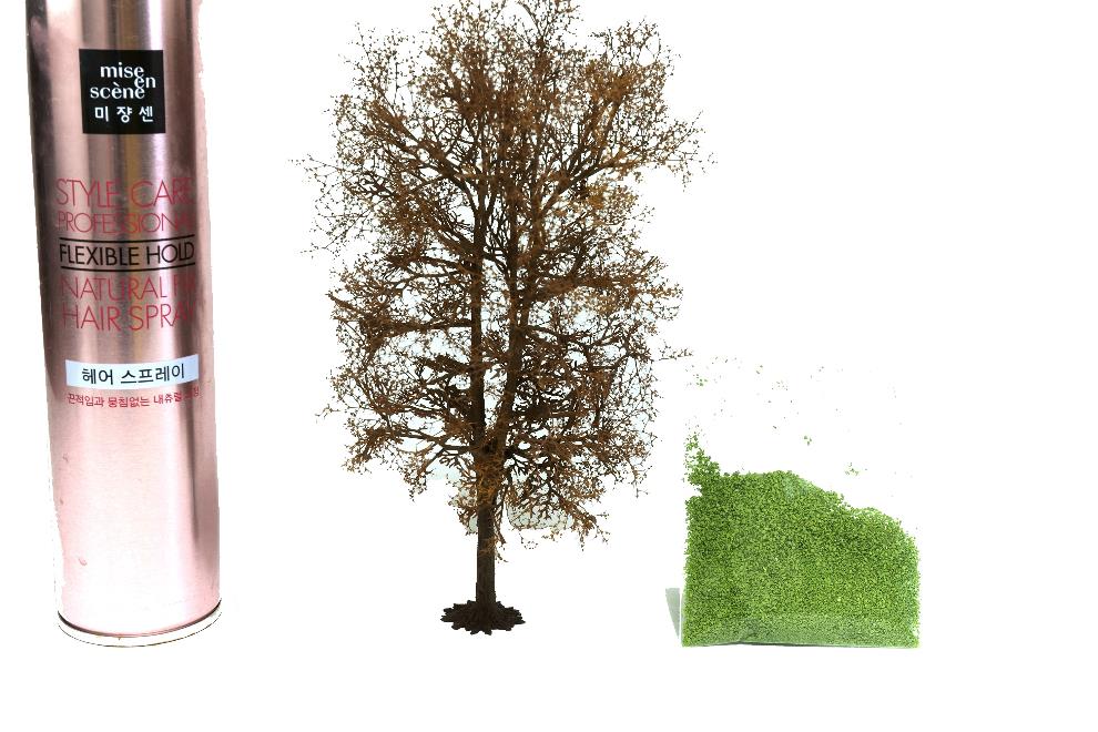 헤어스프레이는 네이쳐트리에 나뭇잎 붙이는데 있어 최적의 아이템 이라 할수있다. 입자가 매우곱게 분사되기때문에 덩어리지지 않는다. 또한 구성 후 끈적거림이나 광이 나지 않는다.나무에 헤어스프레이를 분사한후 나뭇잎시귀 재료를 뿌려준다. 여기서 중요한 포인트는 스프레이를 한번 뿌린 후 나뭇잎 올리는 작업을 반복하여 두번 해주는 점이다. 그렇게 해야 네이쳐트리의 끝자락까지 나뭇잎이 붙는다. 건조될때가지 기다릴 필요없이 연속으로 두번 나뭇잎사귀를 붙여준다.