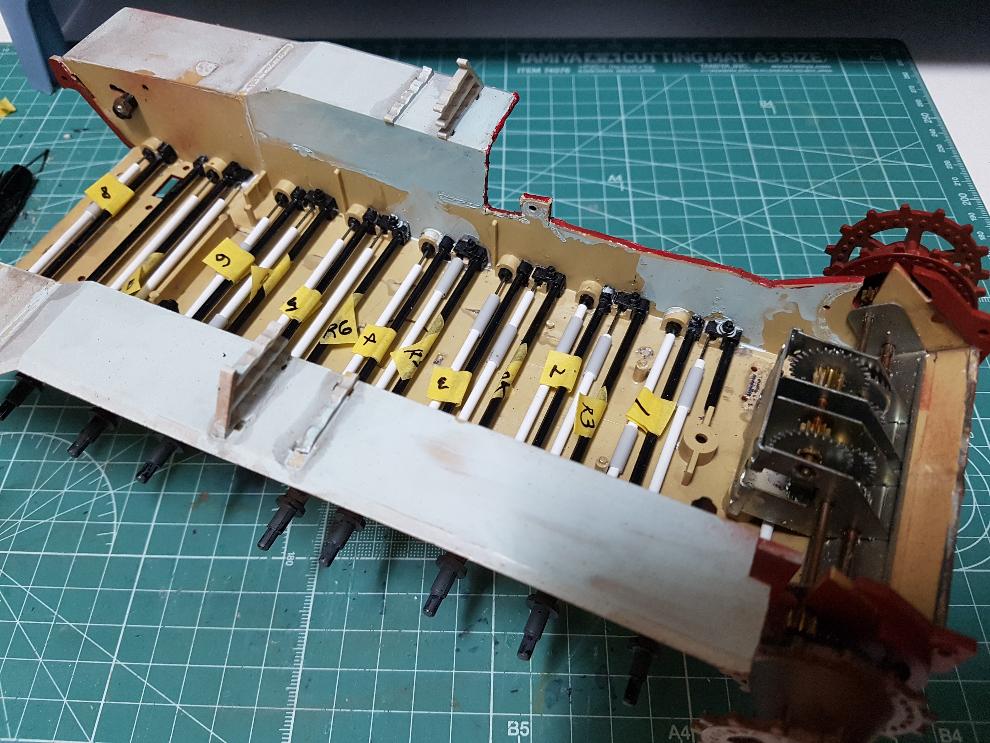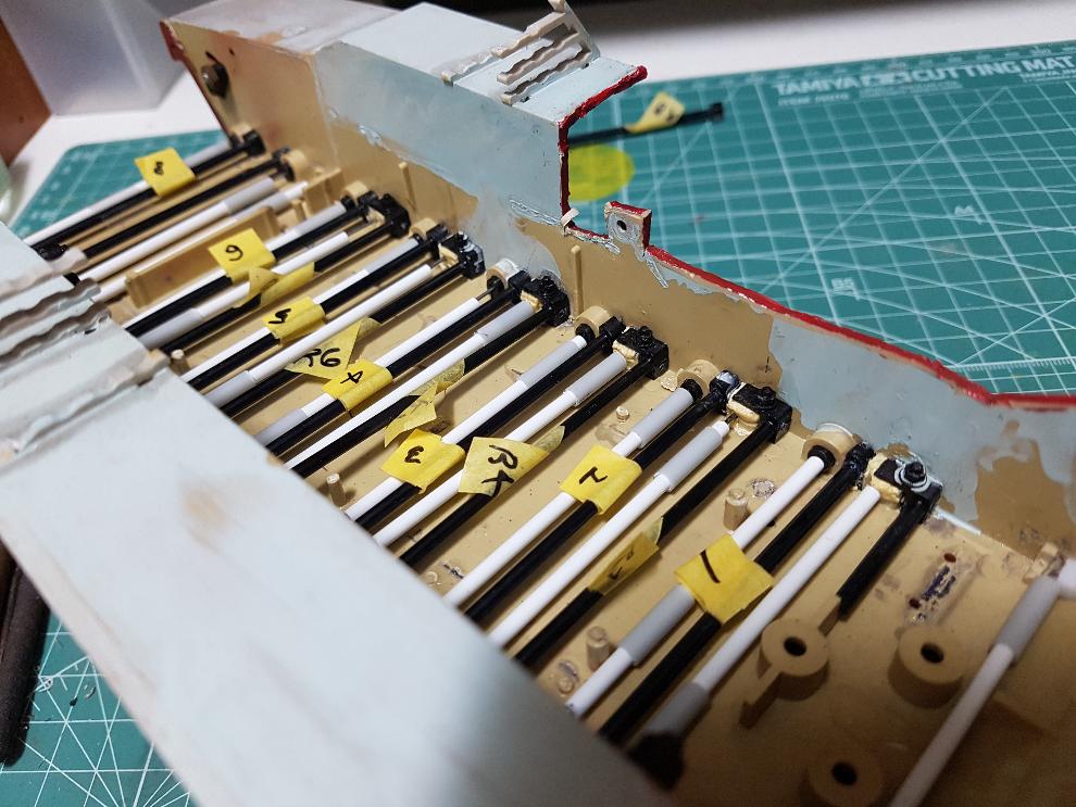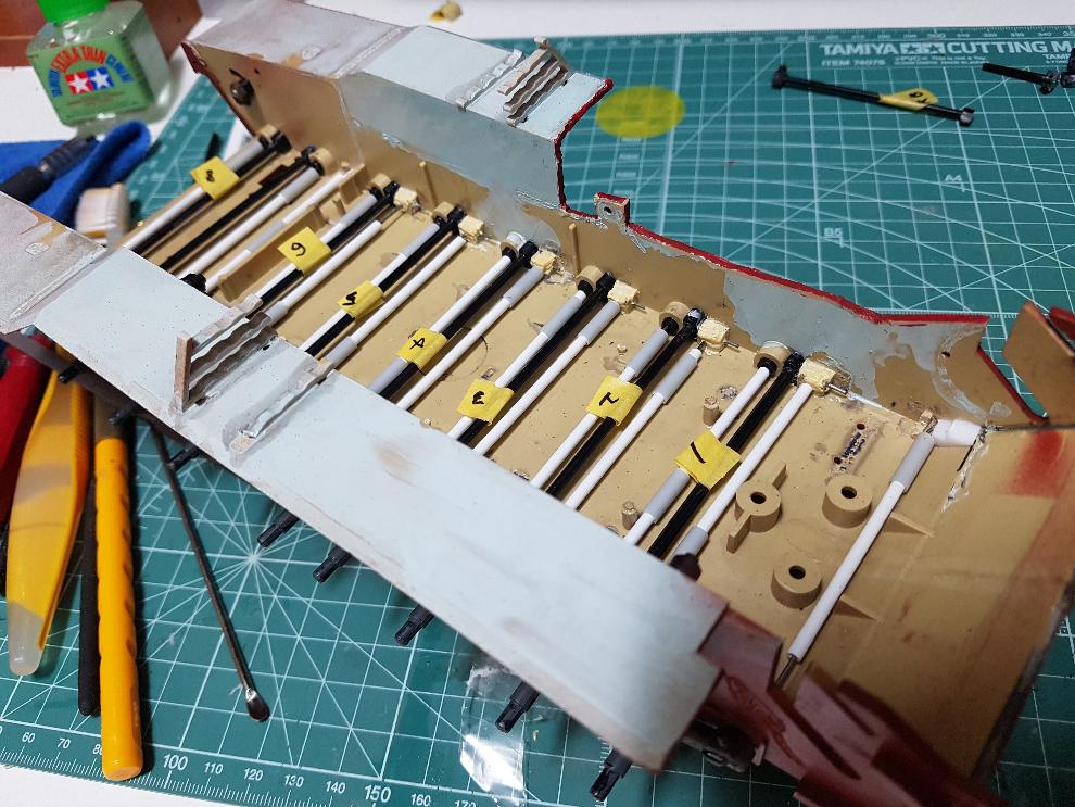 서스펜션 배치, 피아노선 커버 프라파이프 삽입, 마운트 가공, 묶음 파츠 가공 및 배치 등이 된 상태입니다.