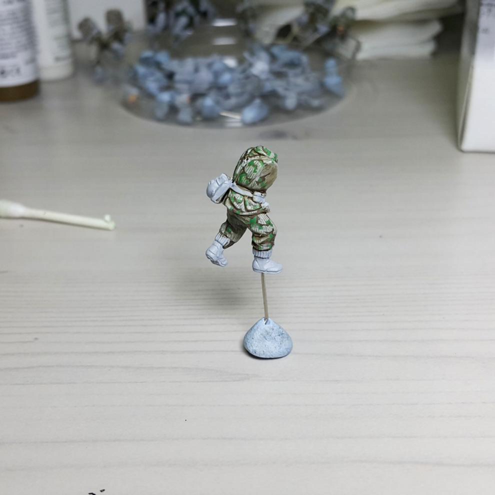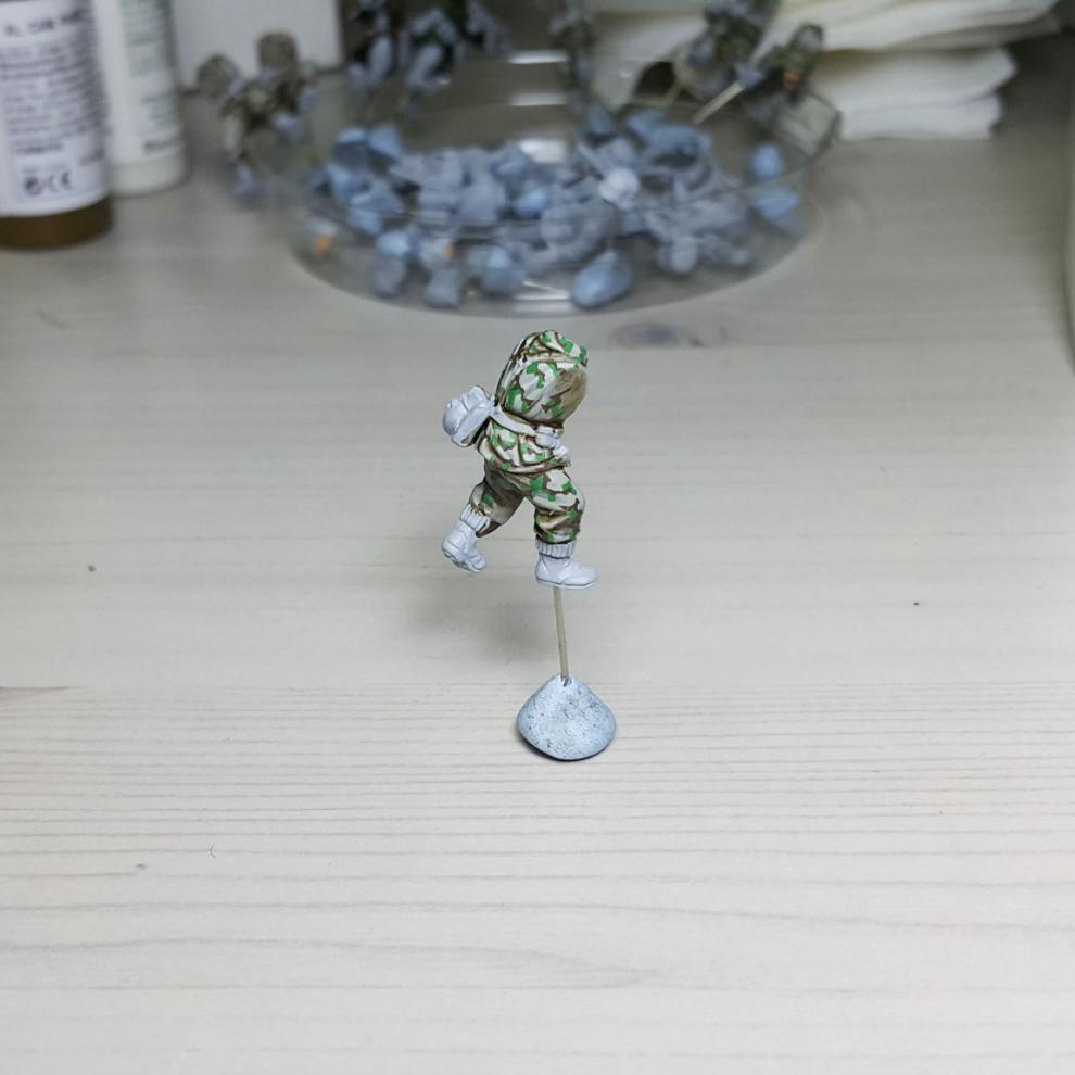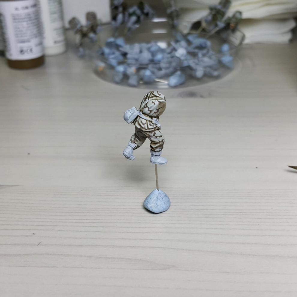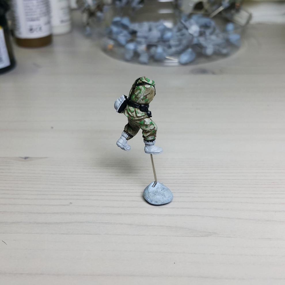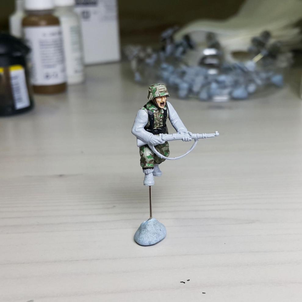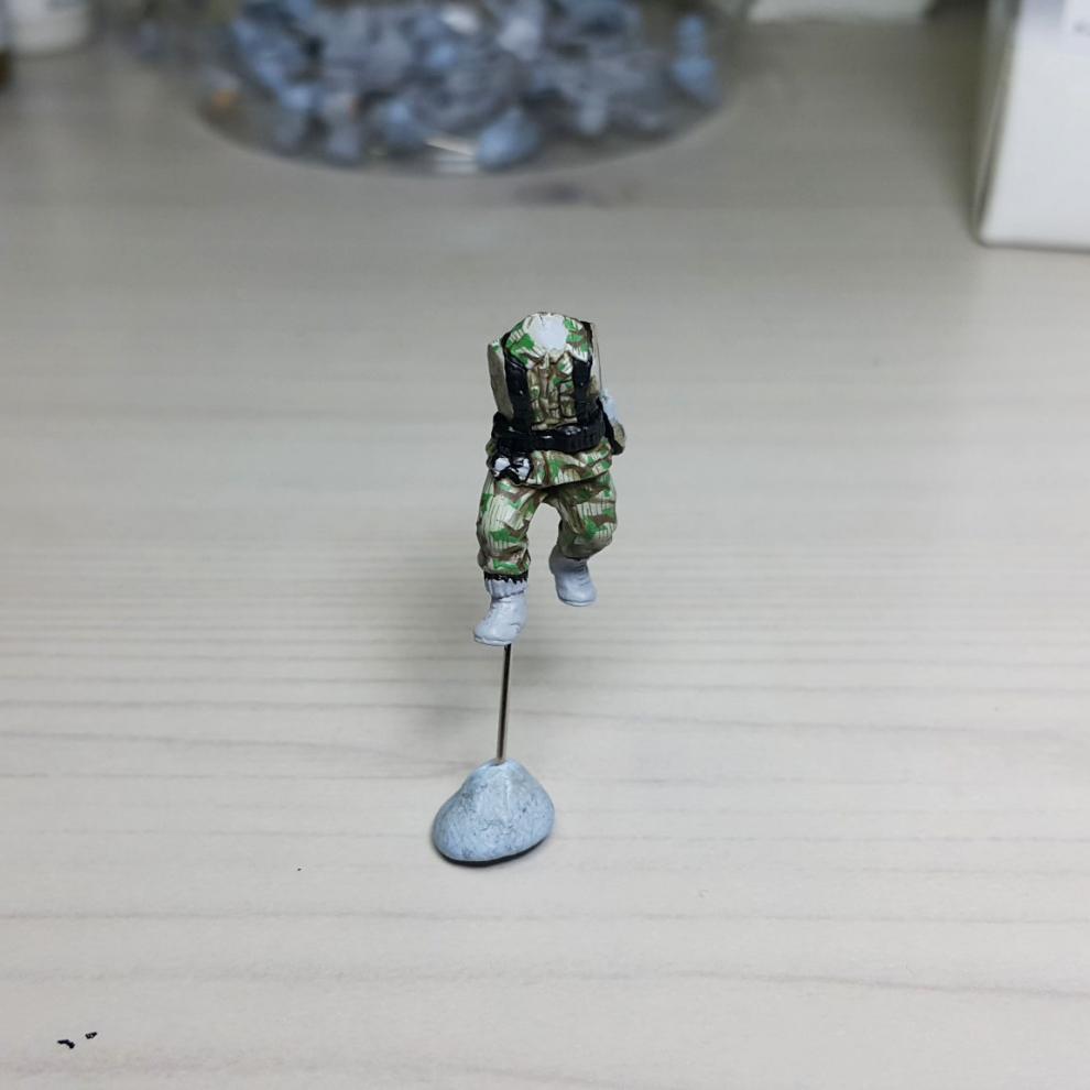 한 차례 도색이 끝나고, '스플린터 카모 베이스'가 마르면 '시타델 워시'를 희석하여 발라줍니다. 현재에는 '시타델 셰이드(Citadel shade)'라는 제품으로 변경되었는데, 같은 회사의 'Lahmian Medium'을 섞어 2:3 정도 비율로 만드신 뒤에 발라주시면 되겠습니다. 전체적으로 한번 발라주시고 기다리시면 셰이드가 구석진 데에서 뭉치며 음영을 만들어줍니다. 이 뒤에 셰이드가 덜 모인 부분들을 중점으로 엷게 희석한 '스플린터 카모 베이스'를 이용하여 강조해주시고, 최종적으로 '화이트<저먼 탱크 크루>'를 이용해서 주름 등 제일 종단(Edge)부분을 강조해줍니다.