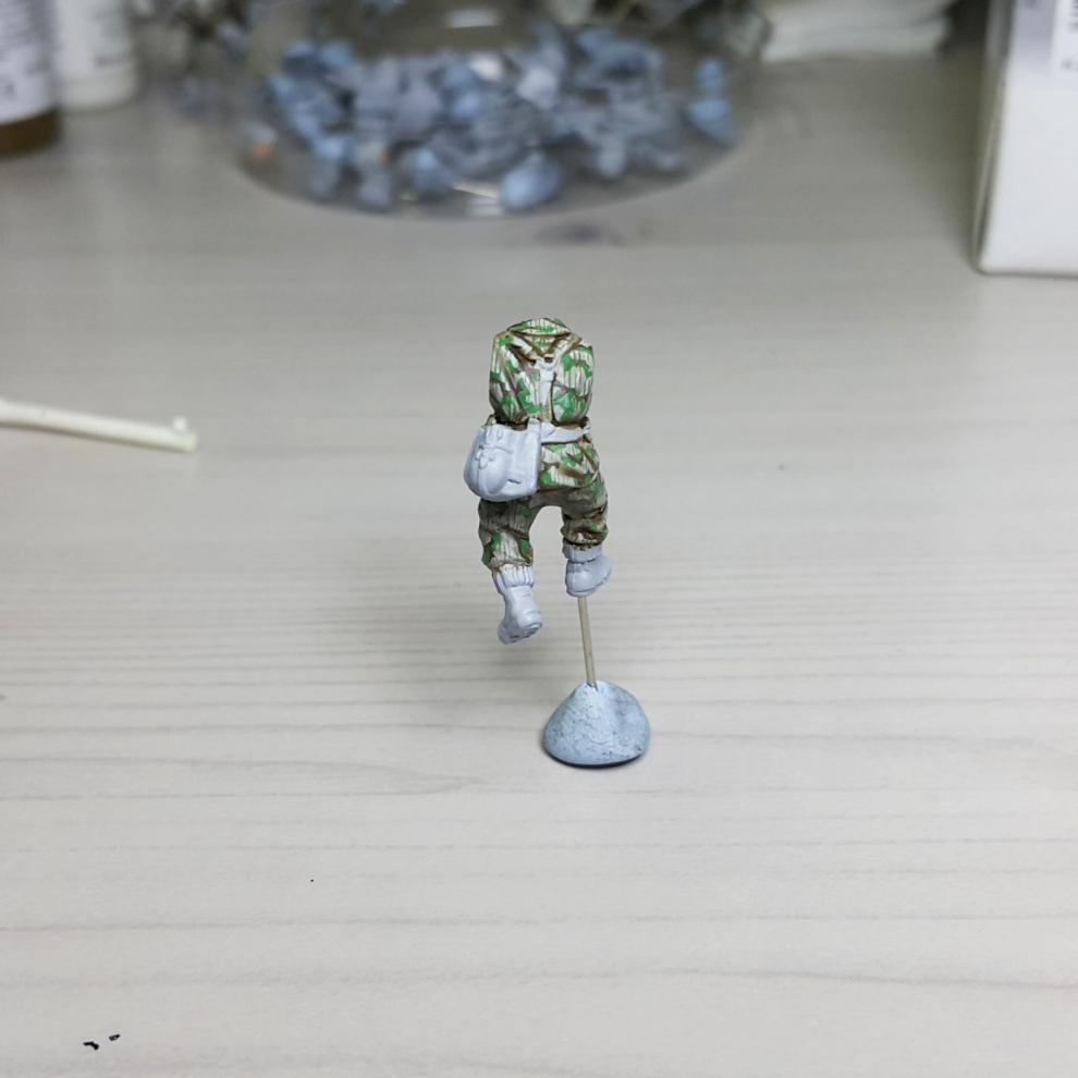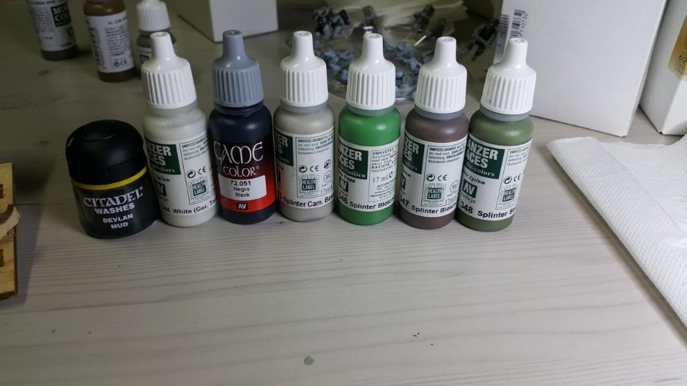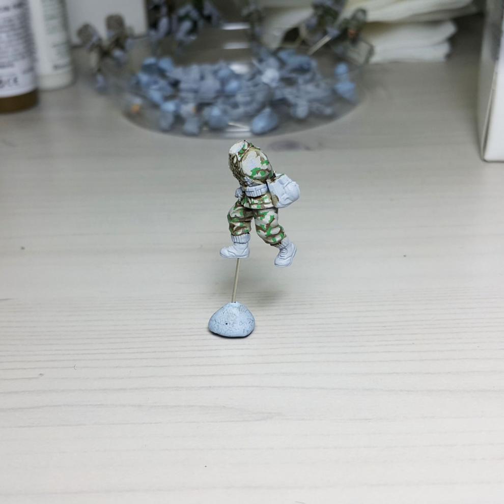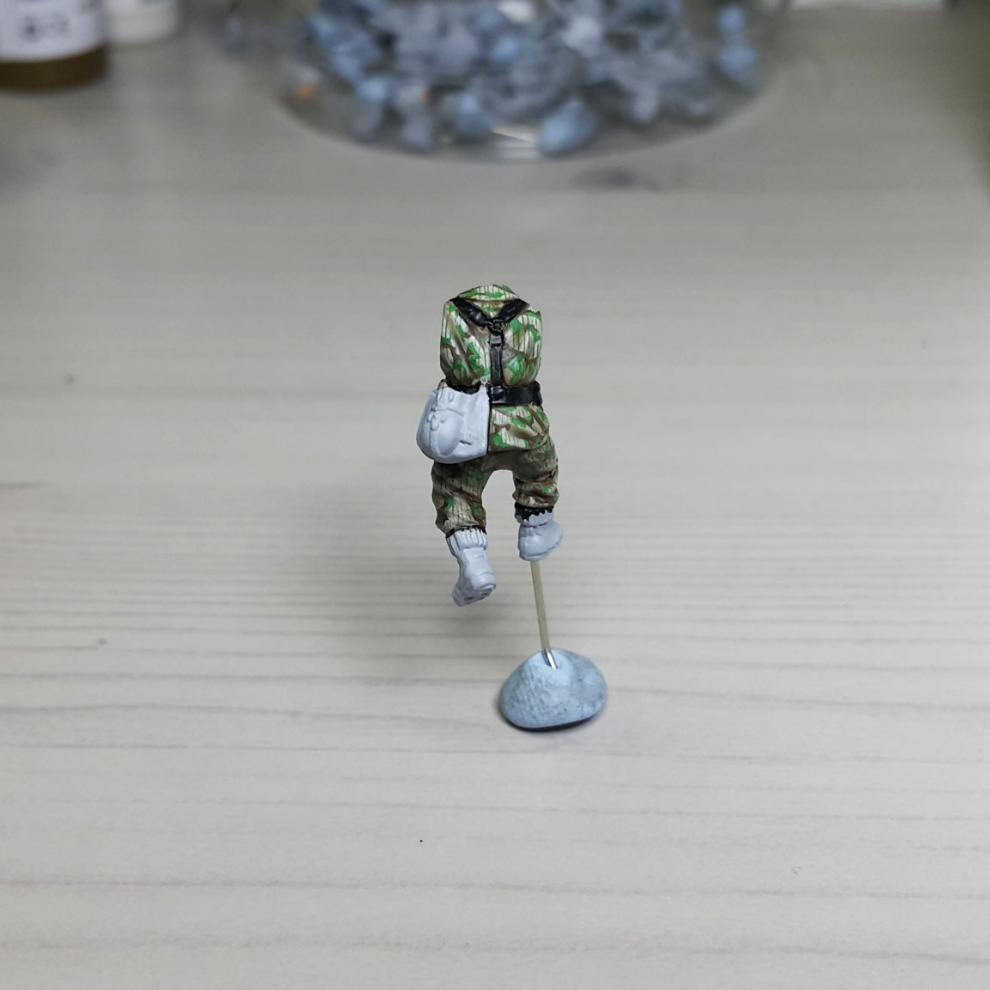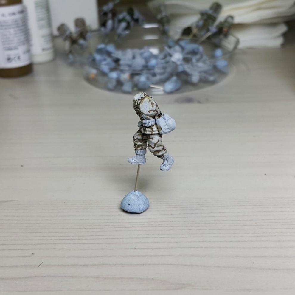 한 차례 도색이 끝나고, '스플린터 카모 베이스'가 마르면 '시타델 워시'를 희석하여 발라줍니다. 현재에는 '시타델 셰이드(Citadel shade)'라는 제품으로 변경되었는데, 같은 회사의 'Lahmian Medium'을 섞어 2:3 정도 비율로 만드신 뒤에 발라주시면 되겠습니다. 전체적으로 한번 발라주시고 기다리시면 셰이드가 구석진 데에서 뭉치며 음영을 만들어줍니다. 이 뒤에 셰이드가 덜 모인 부분들을 중점으로 엷게 희석한 '스플린터 카모 베이스'를 이용하여 강조해주시고, 최종적으로 '화이트<저먼 탱크 크루>'를 이용해서 주름 등 제일 종단(Edge)부분을 강조해줍니다.