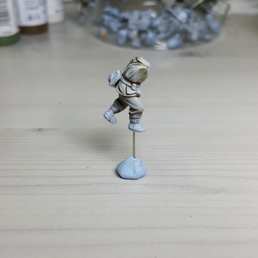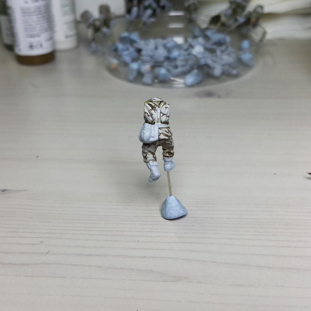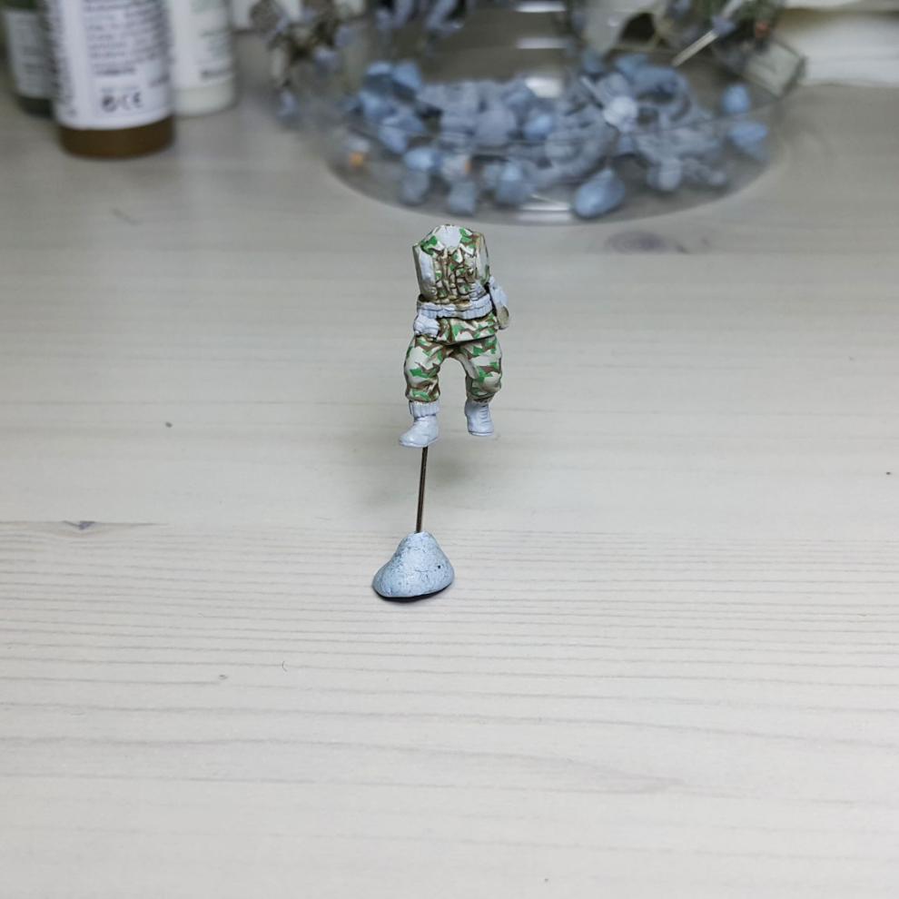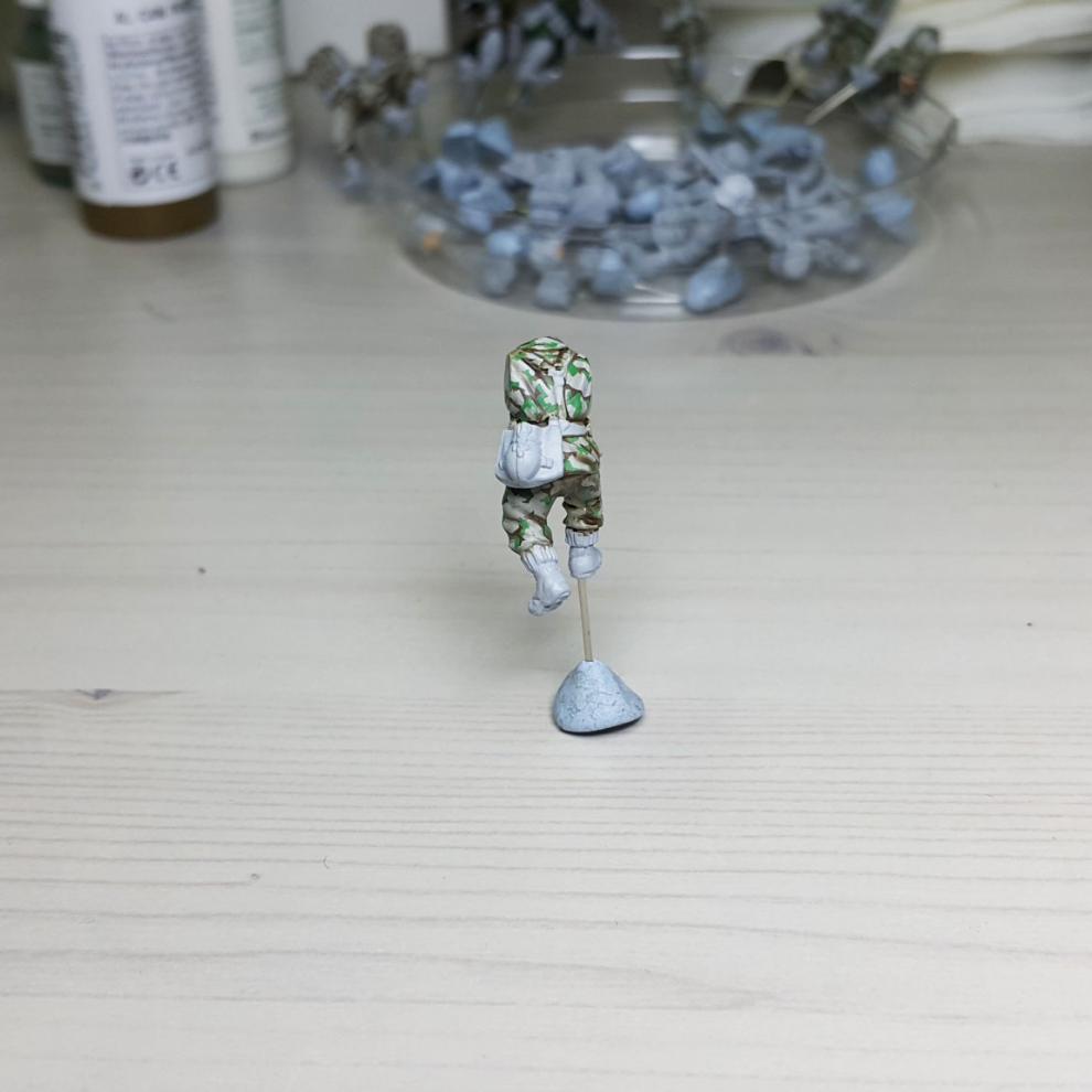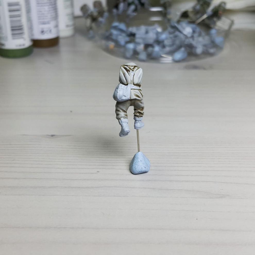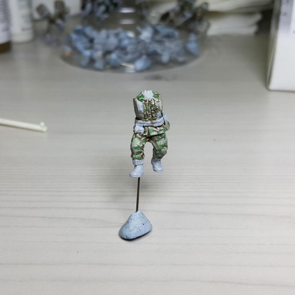 한 차례 도색이 끝나고, '스플린터 카모 베이스'가 마르면 '시타델 워시'를 희석하여 발라줍니다. 현재에는 '시타델 셰이드(Citadel shade)'라는 제품으로 변경되었는데, 같은 회사의 'Lahmian Medium'을 섞어 2:3 정도 비율로 만드신 뒤에 발라주시면 되겠습니다. 전체적으로 한번 발라주시고 기다리시면 셰이드가 구석진 데에서 뭉치며 음영을 만들어줍니다. 이 뒤에 셰이드가 덜 모인 부분들을 중점으로 엷게 희석한 '스플린터 카모 베이스'를 이용하여 강조해주시고, 최종적으로 '화이트<저먼 탱크 크루>'를 이용해서 주름 등 제일 종단(Edge)부분을 강조해줍니다.