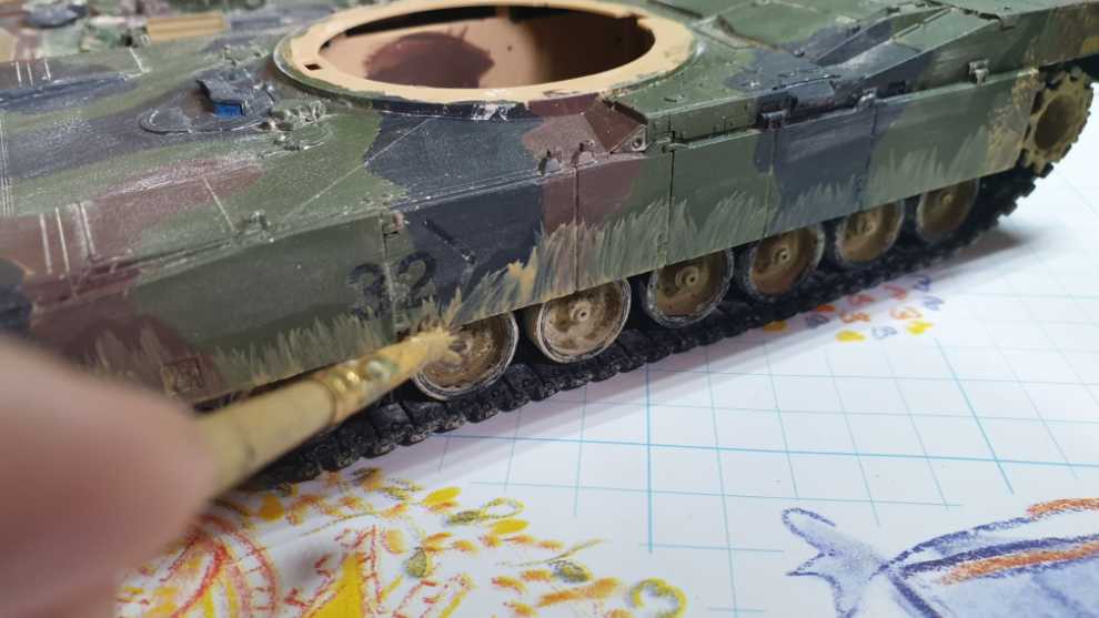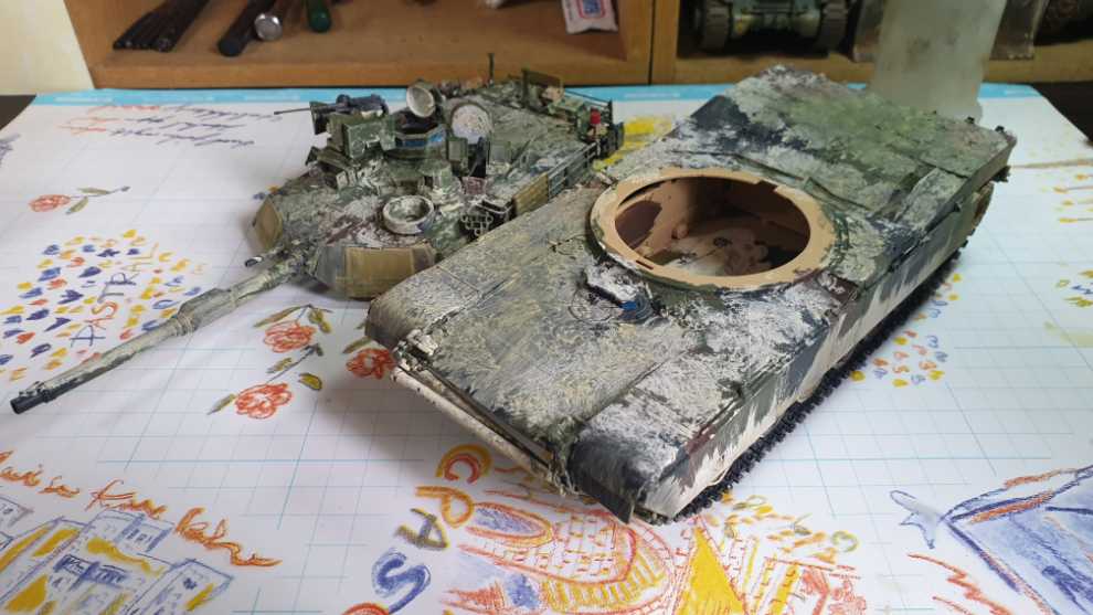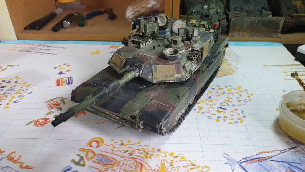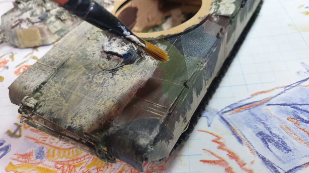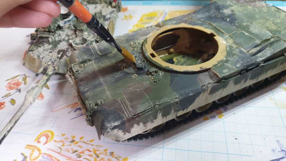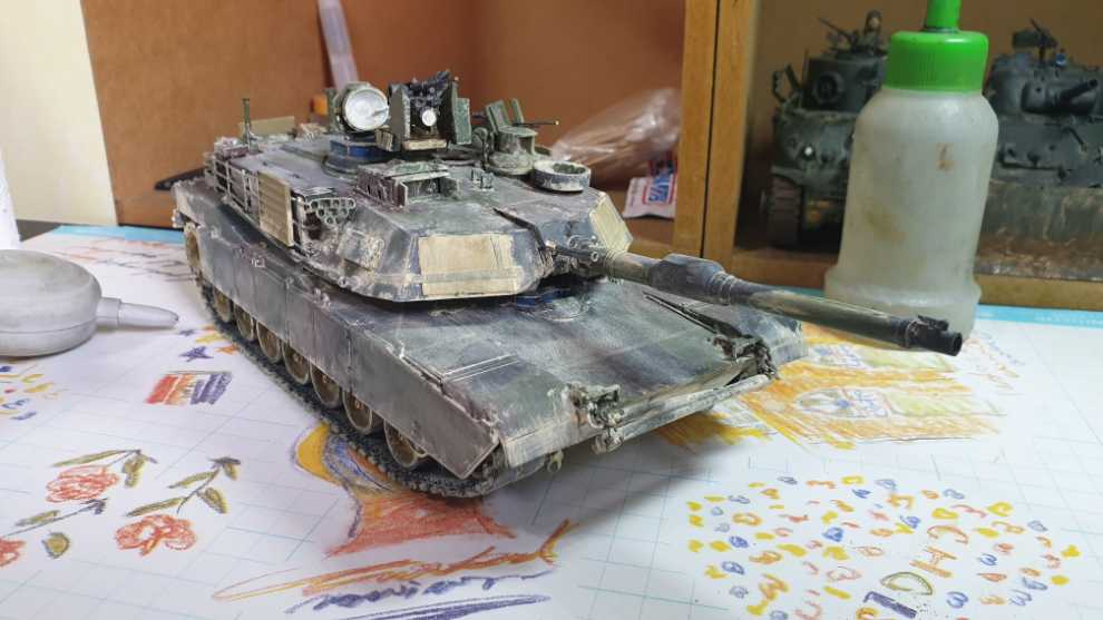 전차 상면을 이렇게 찍어주고 과하다 싶이 해줍니다. 그리고 전차의 후면은 위에서 아래로, 중간, 그러니까 궤도 흙받이 쪽 부터는 아래에서 위로 튄것 처럼 표현합니다. 이때 중요점은 저처럼 에이브람스라면 피아식별패널은 뭍히지 말아주세요. 만질곳이 있어야 합니다. 완벽히 정착이 되지 않아서 손으로 슬슬 문지르면 묻어나기 때문입니다...