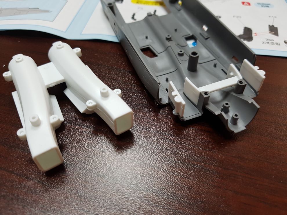 하얀 사출 부분이 상하로 조립되는 인테이크 내부 부품이며 이 부품을 접착후 사진 같이 잘라 내신 후 전방부를 기체에 접착한 후 기체색으로 도장하시고 인테이크는 따로 도장 하시면 인테이크 내부 마스킹의 번거로움을 덜 수 있습니다.
