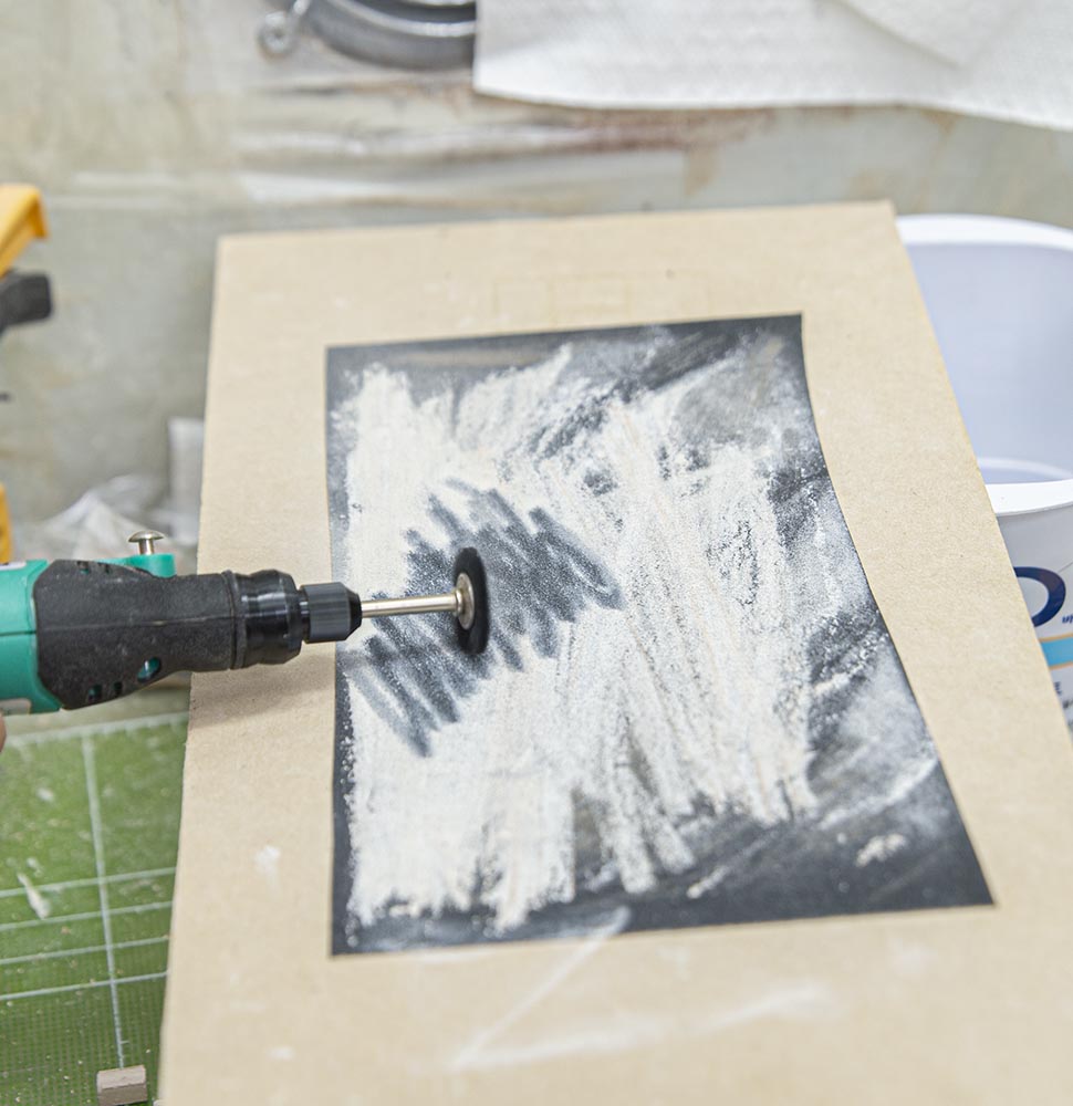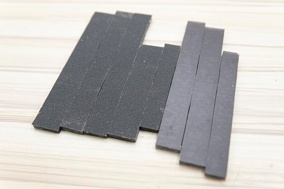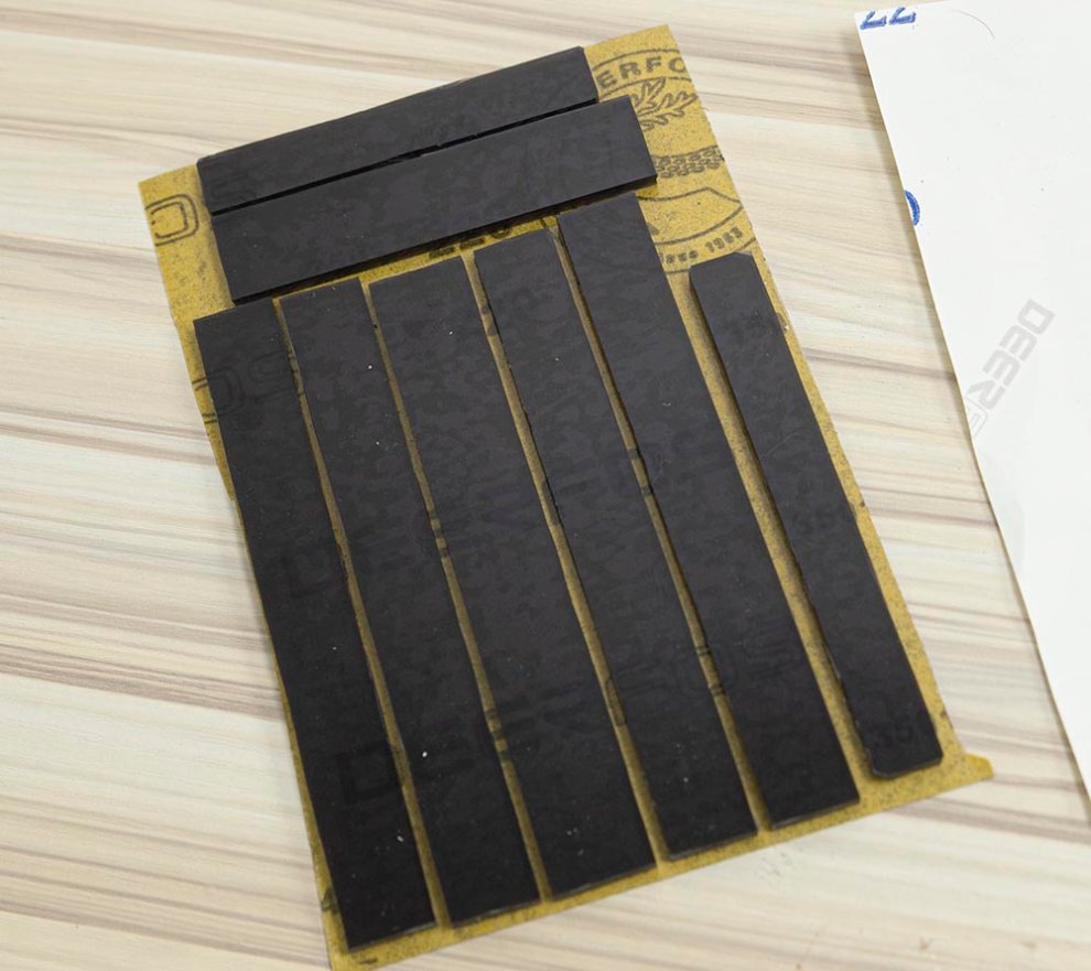적당히 잘라낸 아크릴 스틱을 접착형 사포 220번에 올려줍니다. 그리고 커터칼로 테두리를 따라 쓱쓱 잘라내면 되죠.