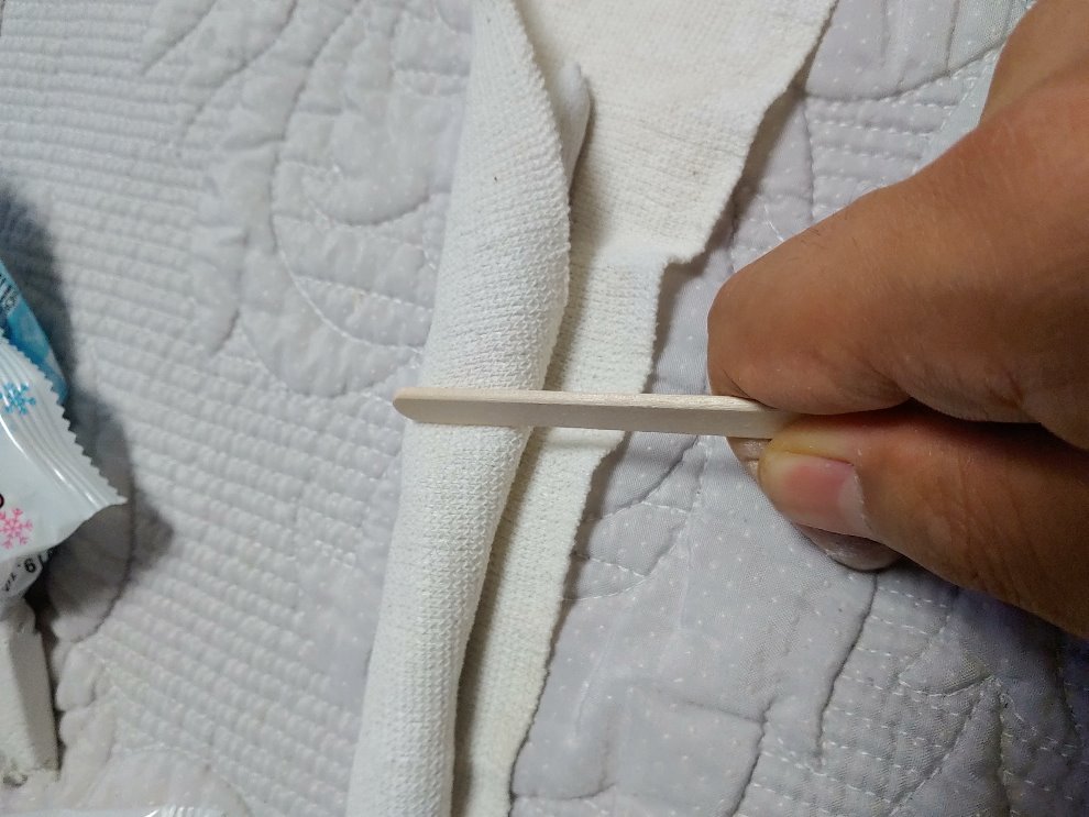 거즈를 덮은뒤 살짝말아주어 질감을냅니다.그리고 열지마시고 아이스크림맏대기로 일정하개 눌러줍니다.