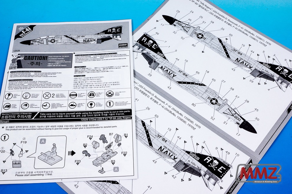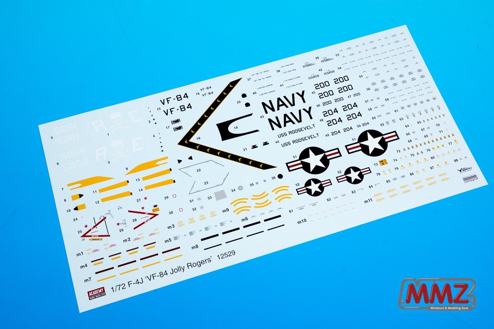 아무래도 에어로 자매 키트는 데칼의 비중이 클 수 밖에 없습니다. 다른 데칼을 넣는 것 만으로도 전혀 다른 키트 대접을 받는 것이 에어로 키트니까요. 이번 제품은 F-4J 비행대 중에 그 유명한 VF-84 졸리로저스를 재현하고 있습니다.
