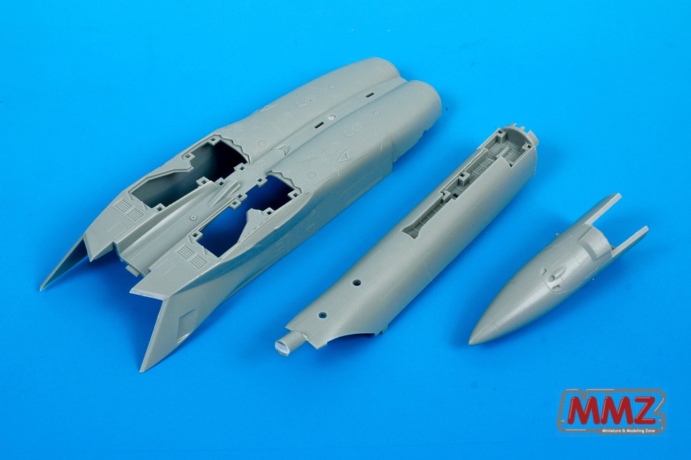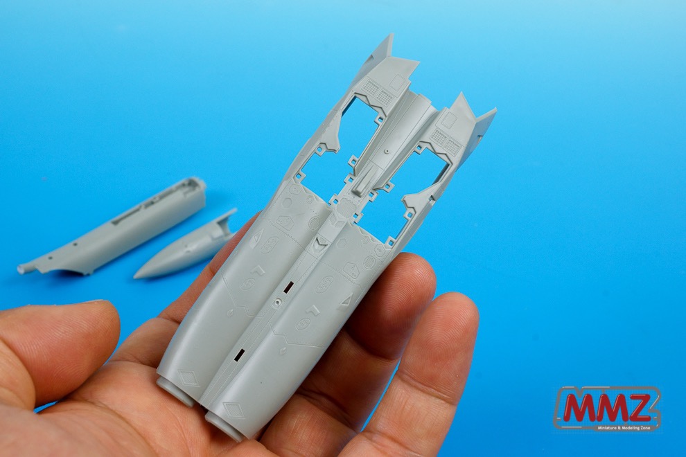 조립 편의성을 높히기 위해 동체 하부와 기수는 일체형 부품으로 사출되어 있습니다. 동체 하부를 보시면 휠베이 커버를 고정하기 위한 커다란 구멍들이 보입니다. 스냅타이트 키트라는 점을 한눈에 파악할 수 있습니다.