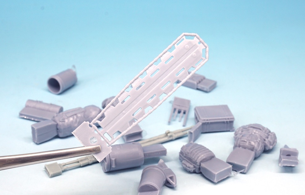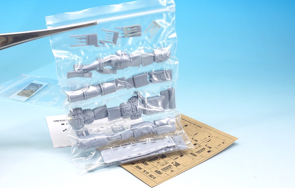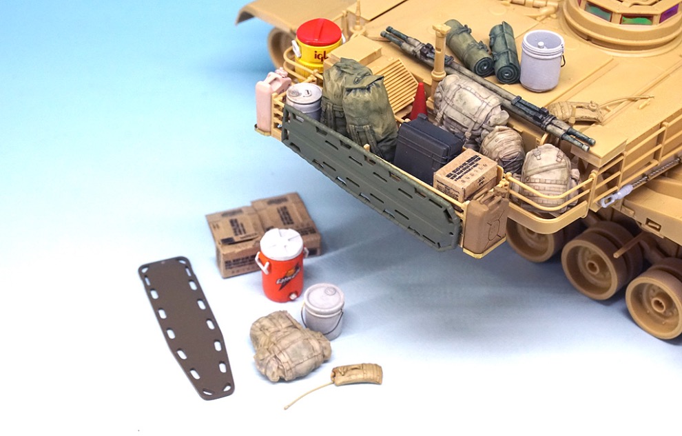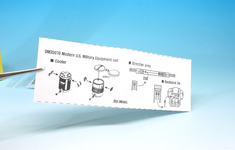 국내 게라지 메이커 Def.model에서는 아카데미의 신 금형 M1A2 키트를 위한 두 가지의 디테일 업 제품을 발매하였습니다. 그 중 하나는 바로 현용 미군의 장비품 세트 입니다. 레진 장비품과 한창의 데칼, 미군의 MRE박스가 인쇄된 크라프트 용지, 작은 설명서로 이루어져 있습니다.
