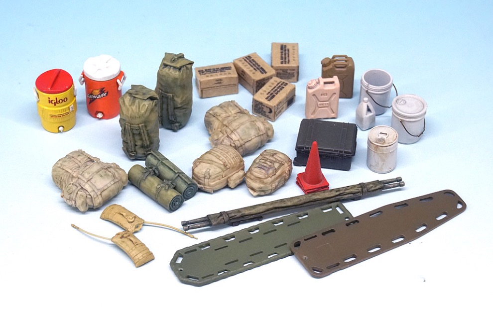 def.model로 부터 제공받은 채색된 전체 제품의 모습. 말아 둔 들것, 각종 장비품들사이에서 민간용 쿨러의 배색이 눈에 띕니다.