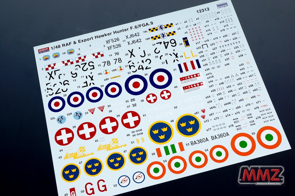 아카데미는 데칼을 교체한 1/48 스케일 호커 헌터를 오래만에 재판합니다. 본 키트의 구성은 과거와 같지만 영국 공군을 비롯한 스위스, 스웨덴등 수출형 사양의 데칼이 포함되어 있습니다.