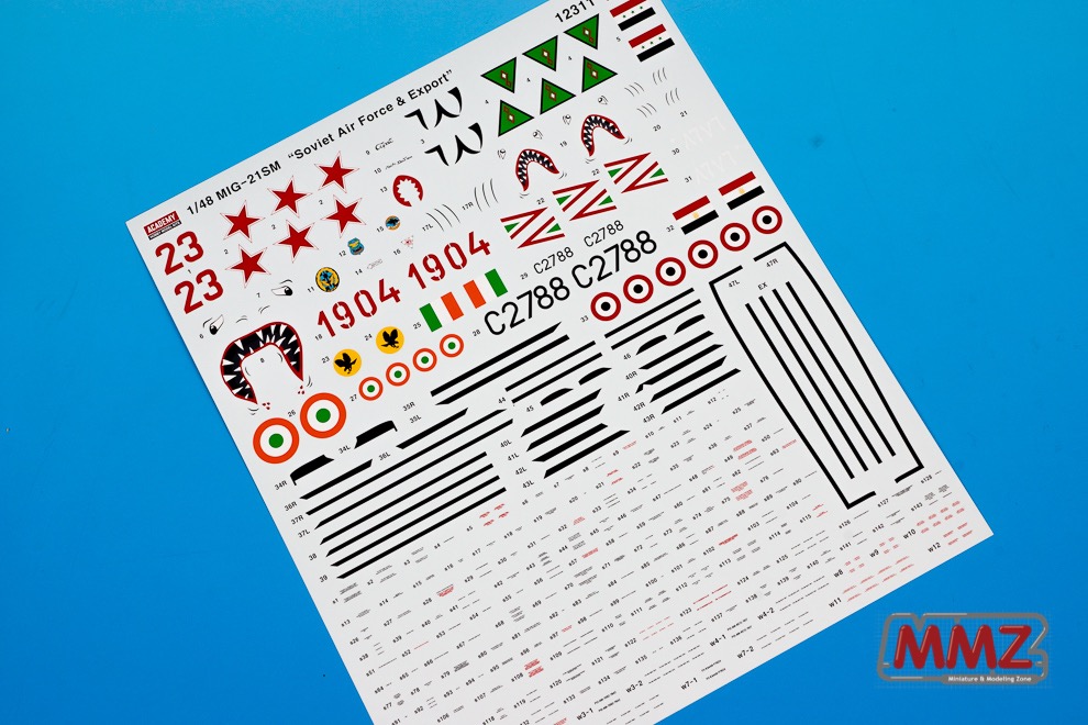 본 제품은 이제 품질의 기준이 된 카르토그라프제의 데칼이 포함되어 있으며 소련, 인도, 이집트, 이라크 등 총 5종의 데칼이 포함되어 있습니다. 다양한 국적의 마킹과 빼곡하게 들어찬 데이터 마킹이 인상적입니다.