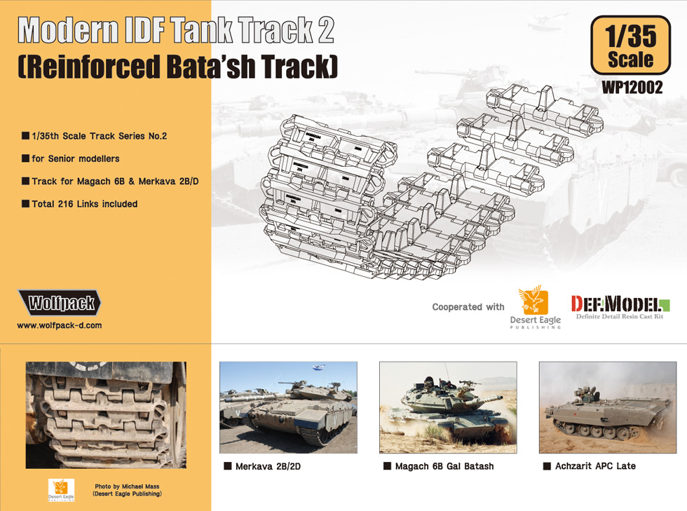 Aero 전문 모형 메이커로 잘 알려진 울프팩 디자인에서 첫 AFV/Military 제품으로 현용 이스라엘 전차 캐터필러 2종(기본형 메르카바/마가크용 궤도와 개량형 강화 궤도)을 출시할 예정입니다.