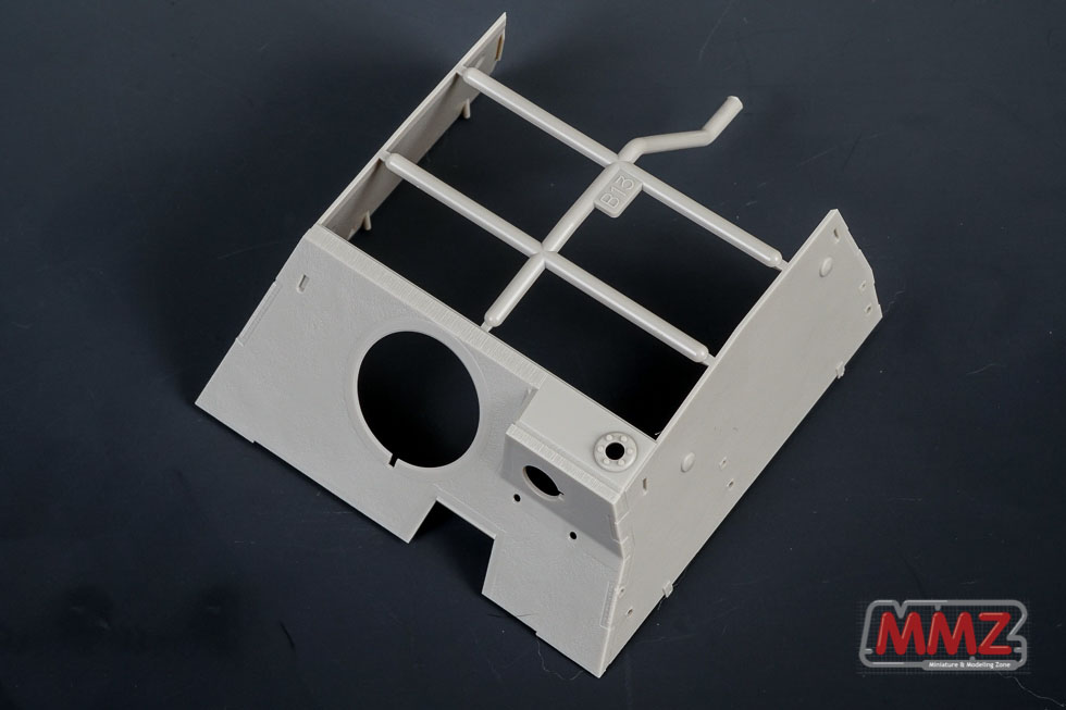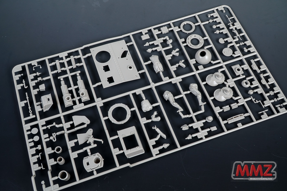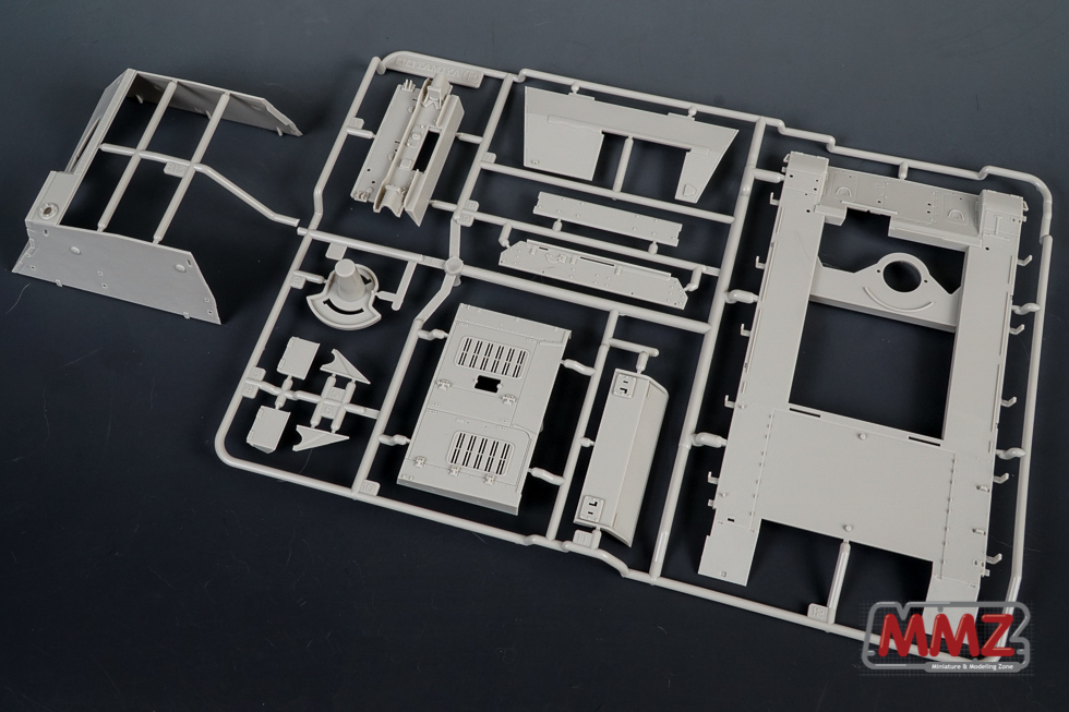 새로 설계된 차체 상부 및 전투실 런너입니다. 전투실은 슬라이드 금형으로 설계되어 있으며 실차와 같이 상부에 얹히는 구조로 되어 있습니다. 차체 상부에 스커트 걸이가 몰드되어 있는 것이 특이합니다.