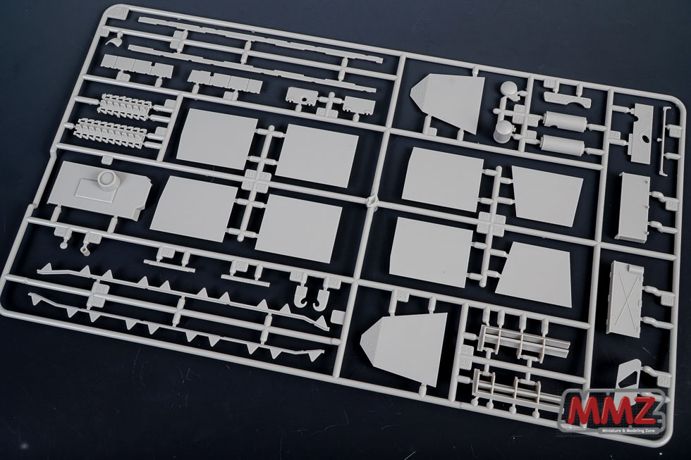 이전 제품과 눈에 띄는 큰 차이점은 측면의 사이드 스커트가 하나하나 전부 별도부품으로 분리되어 있는데 그 결과 예전 4호 전차에 포함된 것보다 좀 더 얇고 재현도가 높습니다. 또 일부분만 장착한 모습을 재현하기가 더 쉽습니다.